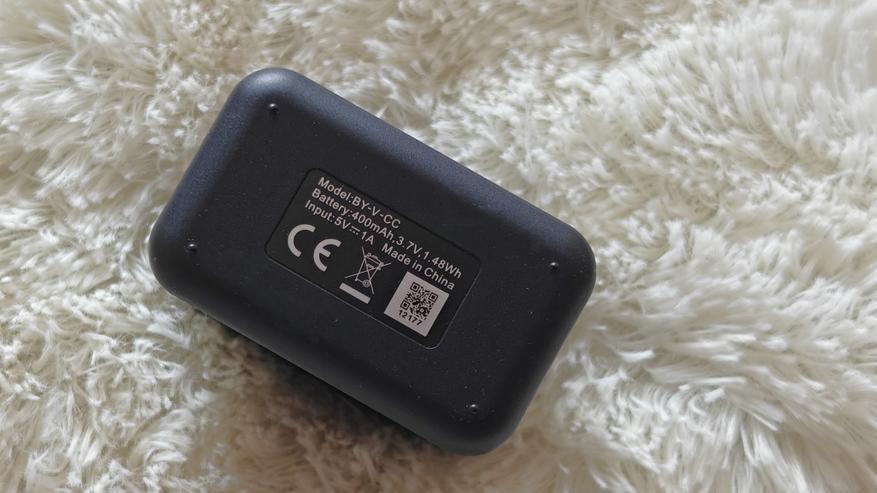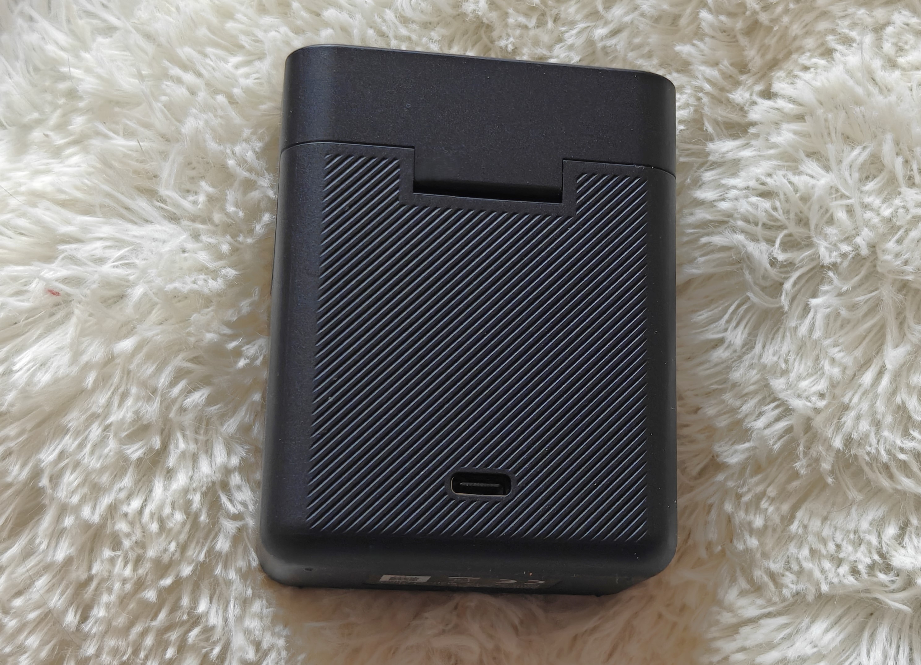 Кейс достаточно крупный, с наименованием производителя на лицевой стороне. Для прочного хвата выполнены насечки на всей поверхности корпуса, на нижней части лицевой стороны расположены светодиодные индикаторы уровня заряда кейса. На обратной стороне размещен пластиковый кронштейне открытия крышки кейса, а на нижней части Type-C разъем для зарядки.