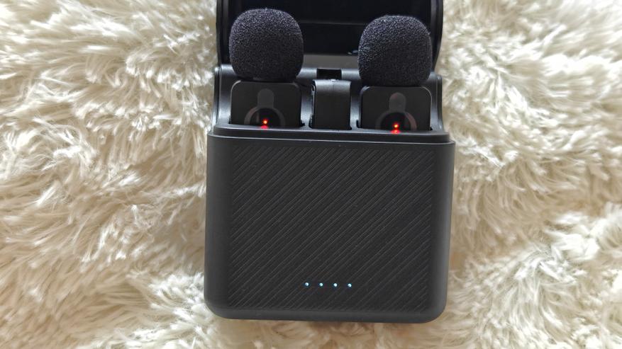 Во время зарядки на микрофонах горят красные индикаторы, а индикаторы уровня заряда кейса белого цвета.