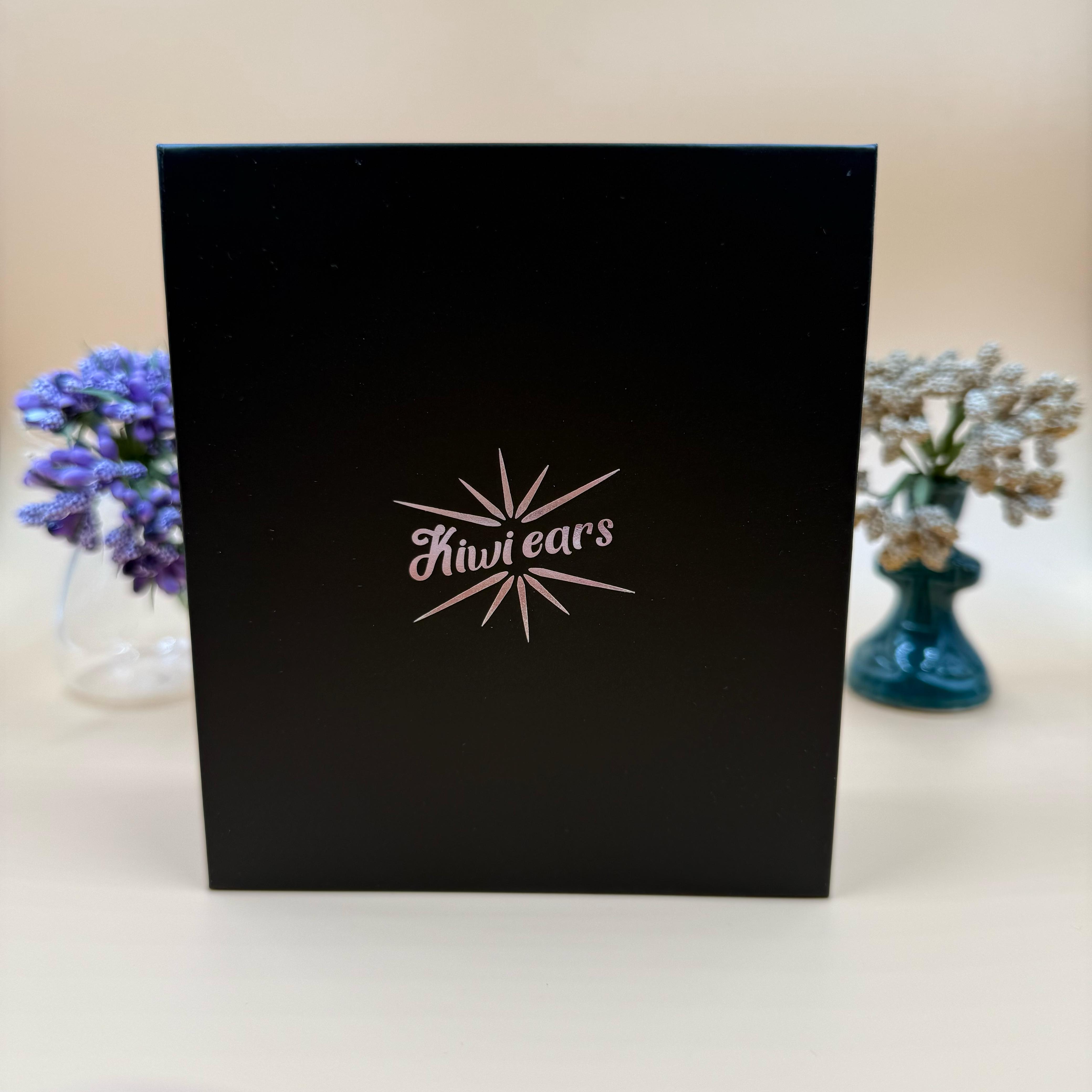Kiwi Ears Airoso поставляются в фирменной, компактной коробке, выполненной в фиолетовых тонах. Предполагаемо, что это любимый цвет дизайнера Kiwi Ears, потому что чаще всего коробки этой компании встречаются именно в этом цвете!