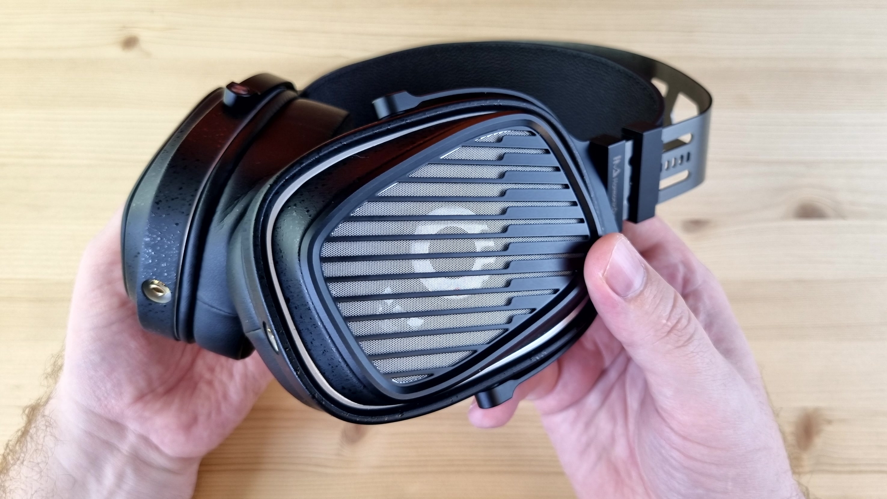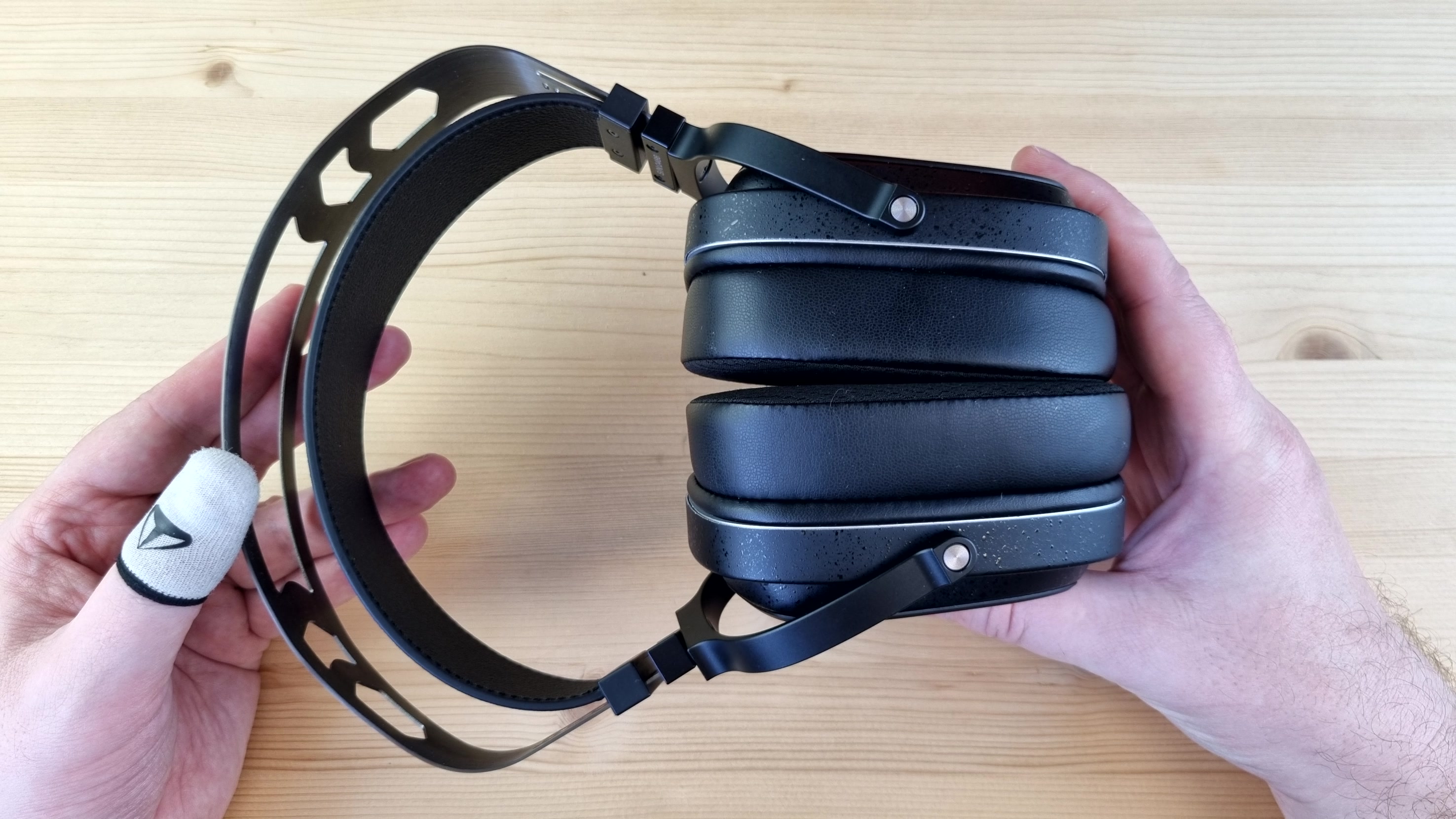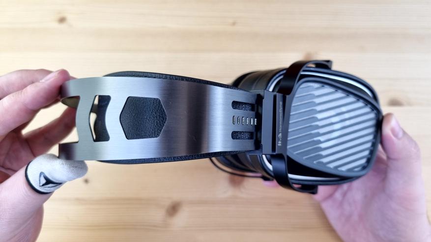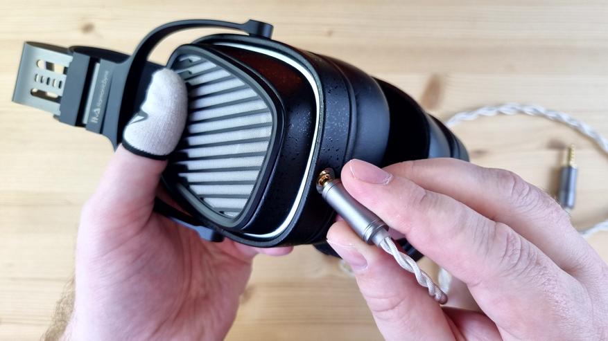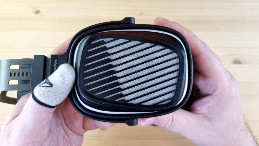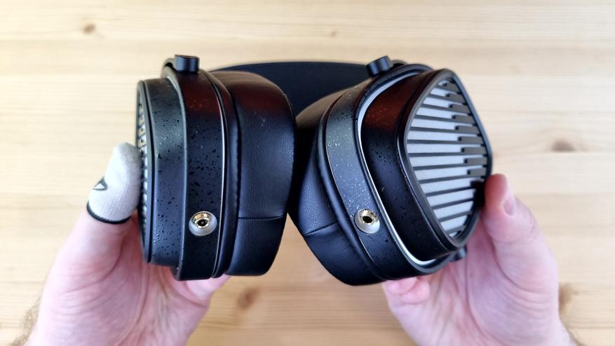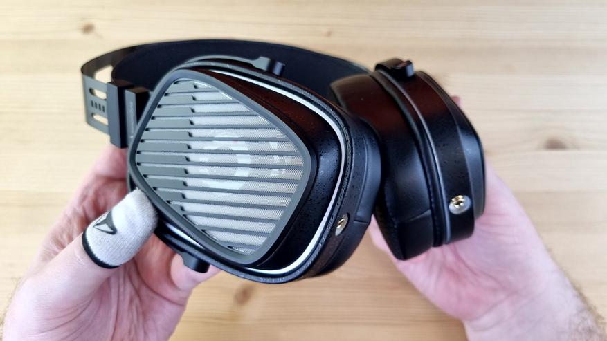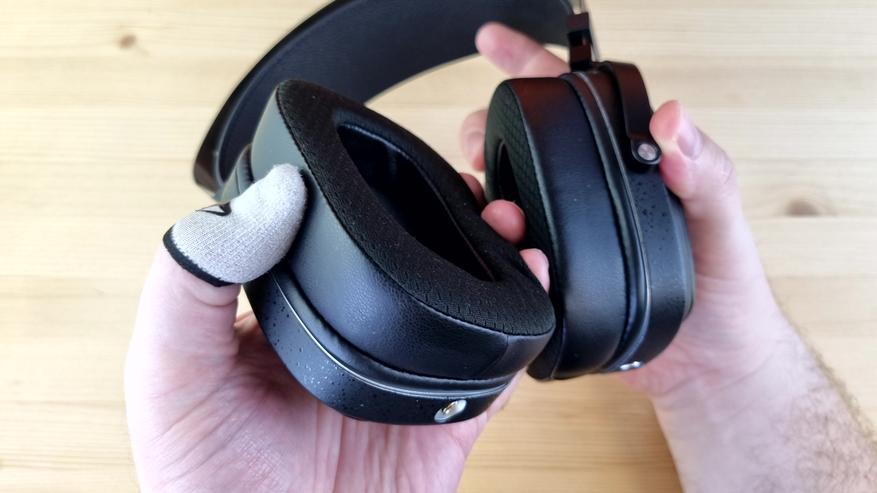 Амбушюры большие, вместительные, на ощупь приятные, с эффектом памяти и тканевой основой. Степеней свободы у наушников две — примерно на 15 и 30 градусов, но ход везде плавный, а не как у Cypher от ThieAudio. Подвижные элементы тут исключительно из металла, широкая фиксация на голове и довольно комфортный вес — около 400 грамм. Уши в них почти не потеют, да и давление сбоку нормальное, то есть сидеть в них можно часами.