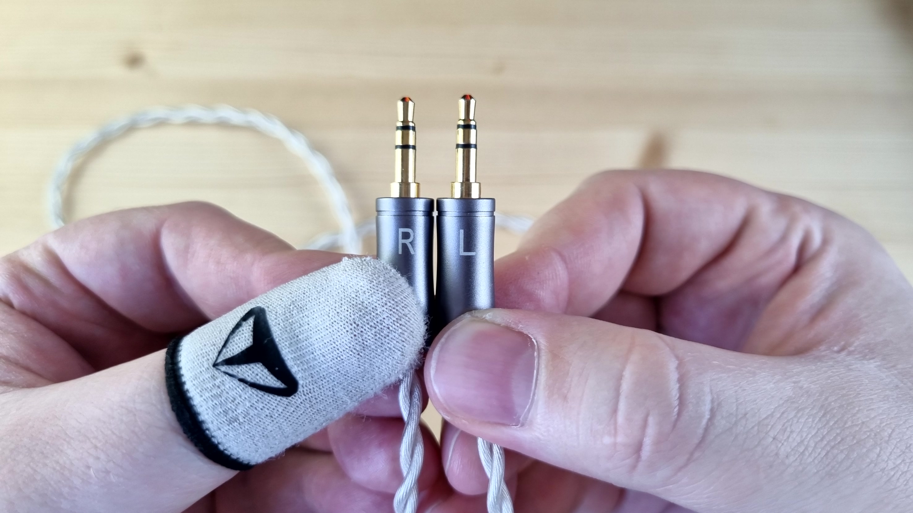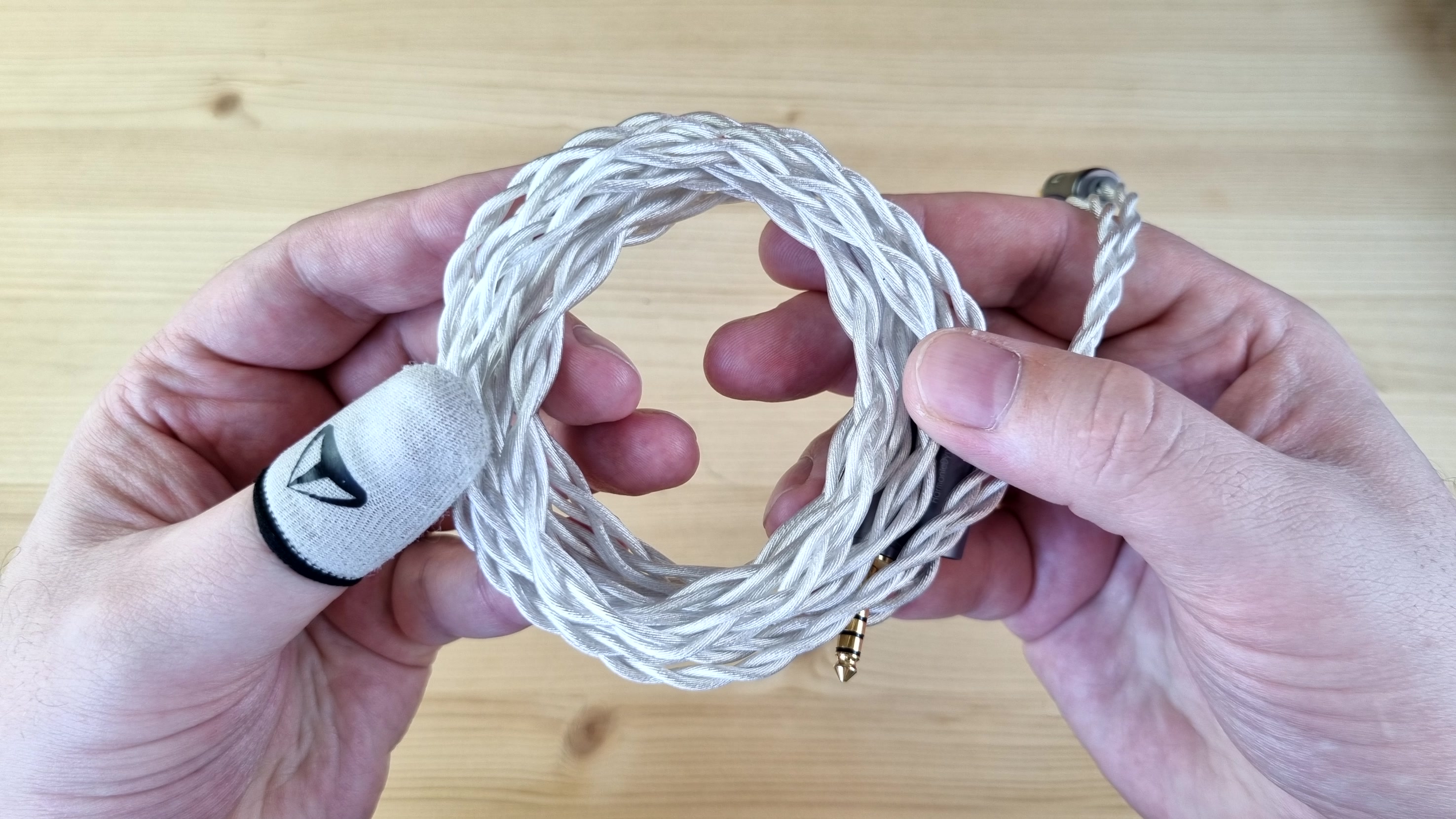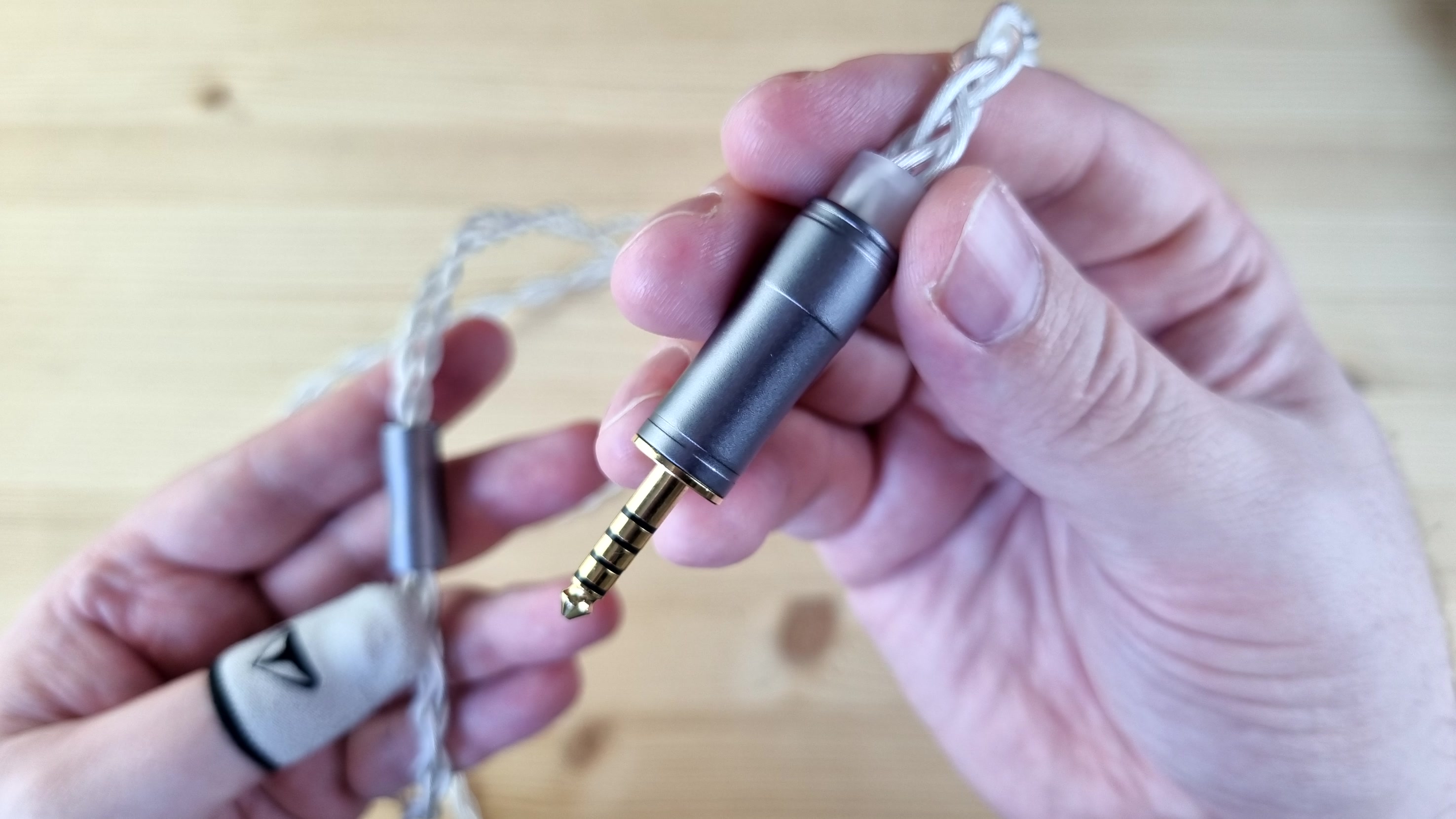 Кабель толстый, плотный, витой, с 3.5 мм джеками для подключения чашечек и балансным 4.4 мм — на вход усилителя. По сопротивлению у него просто фантастические 0.09 Ома на каждой из жил. Шикарный кабель — менять такой не нужно.