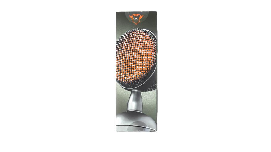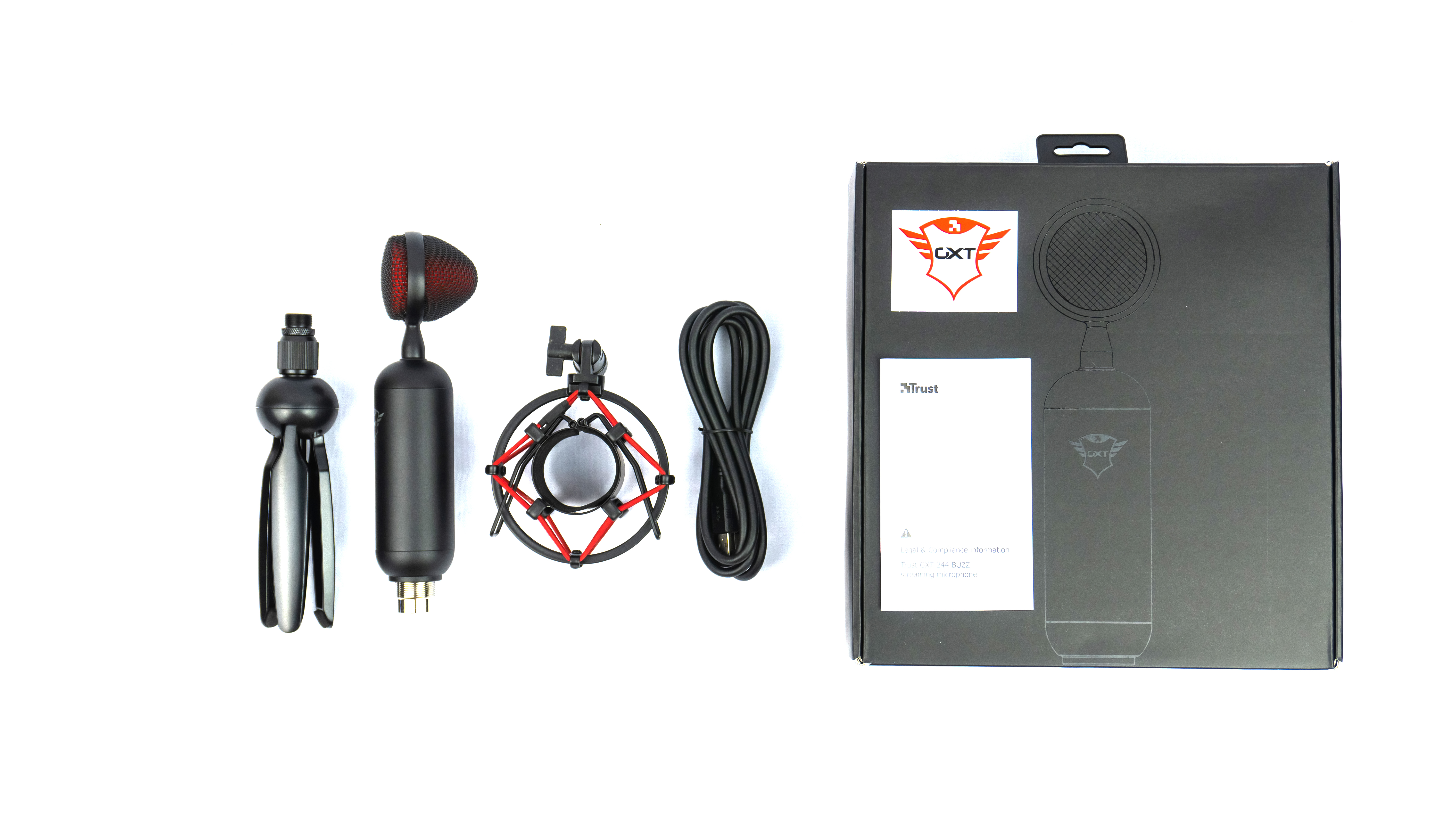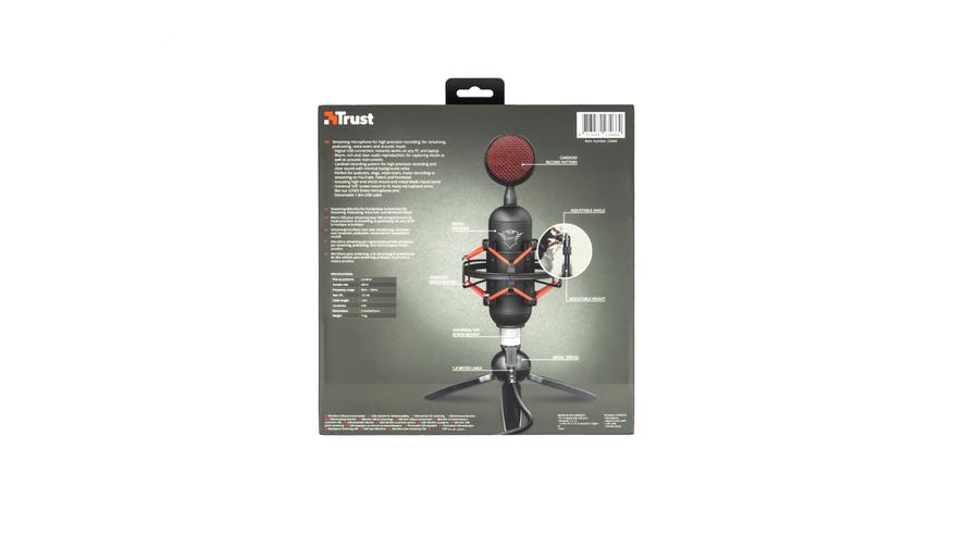 По центру лицевой стороны расположено фото микрофона в собранном виде. По углам от фото: логотип компании Trust, логотип GXT, модель микрофона “BUZZ” с пояснением – «микрофон потоковой записи».