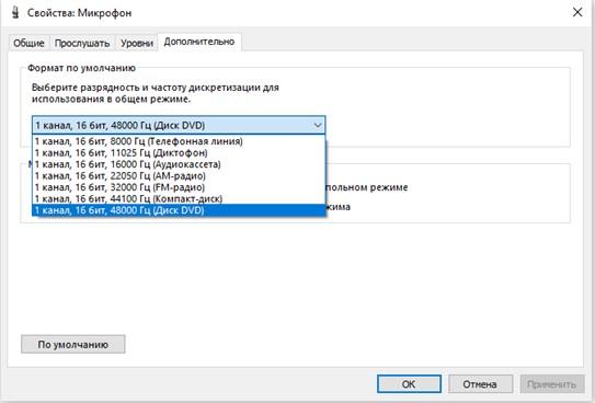 Из стандартных настроек для микрофона в OS Windows 10 доступно изменение уровней для изменения уровня громкости. Имеется и вкладка с дополнительными функциями, для изменения формата записи до 48 кГц.