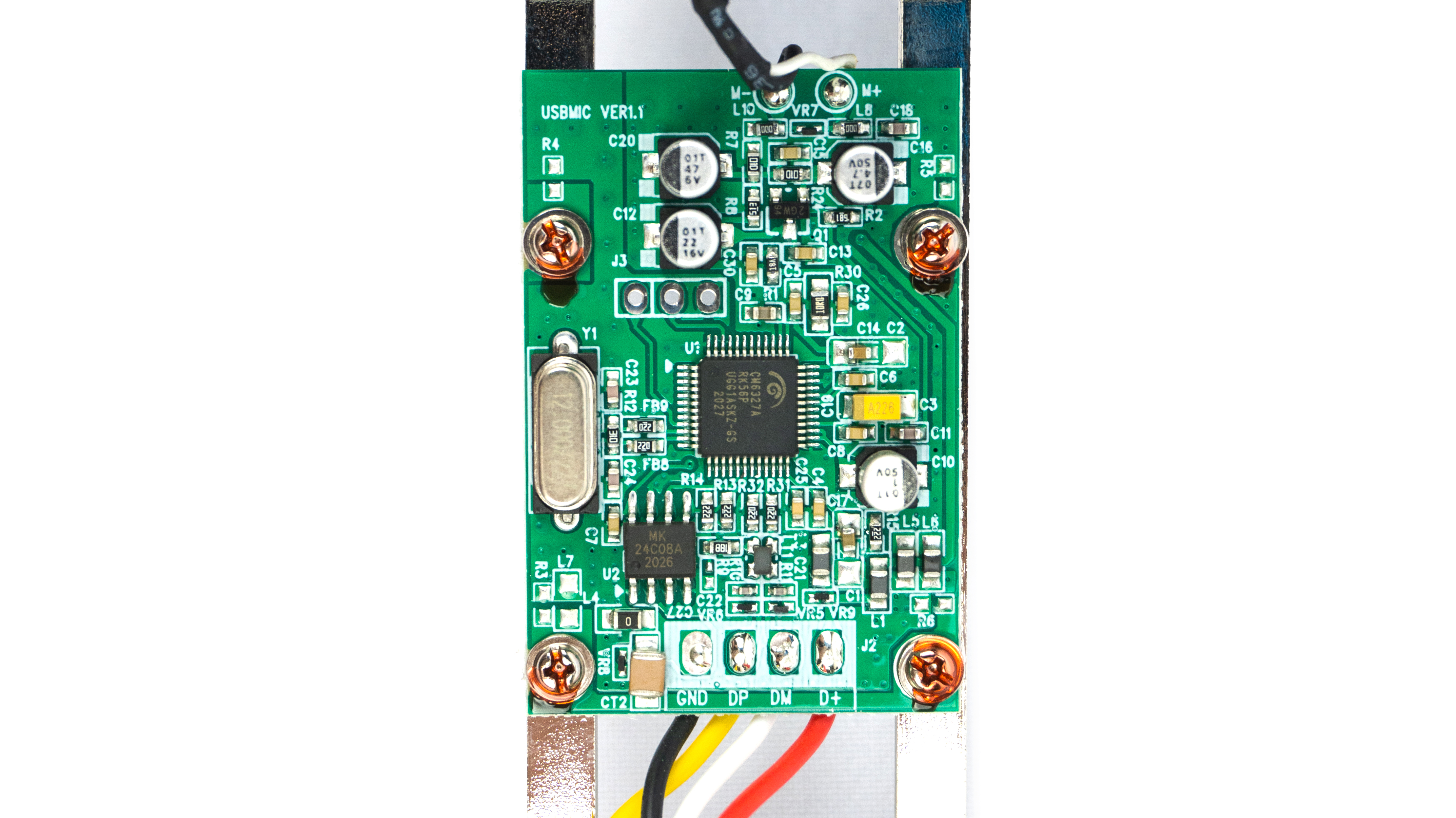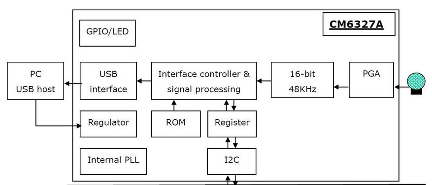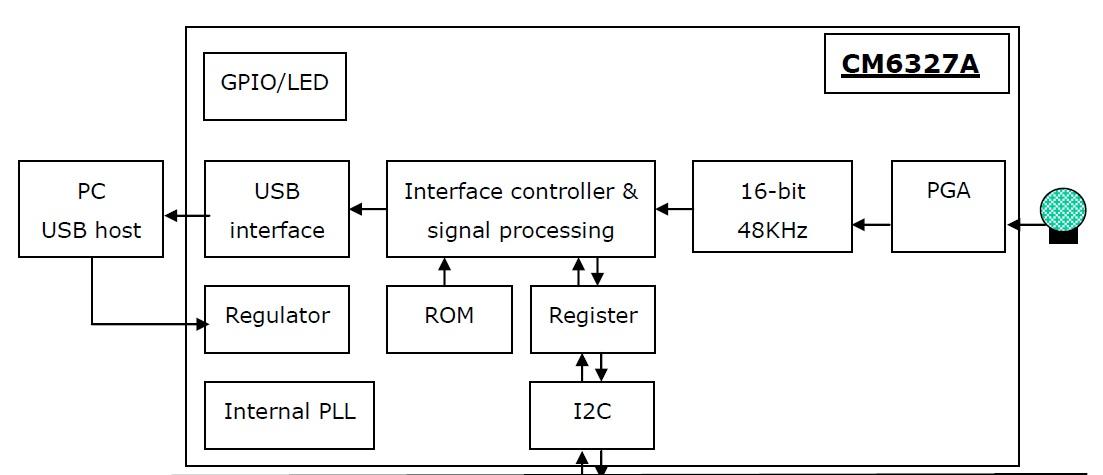 Микрофон изготовлен на базе одно чиповой микросхемы CMEDIA CM6327A, спроектированный для продуктов с потоковым вещанием.