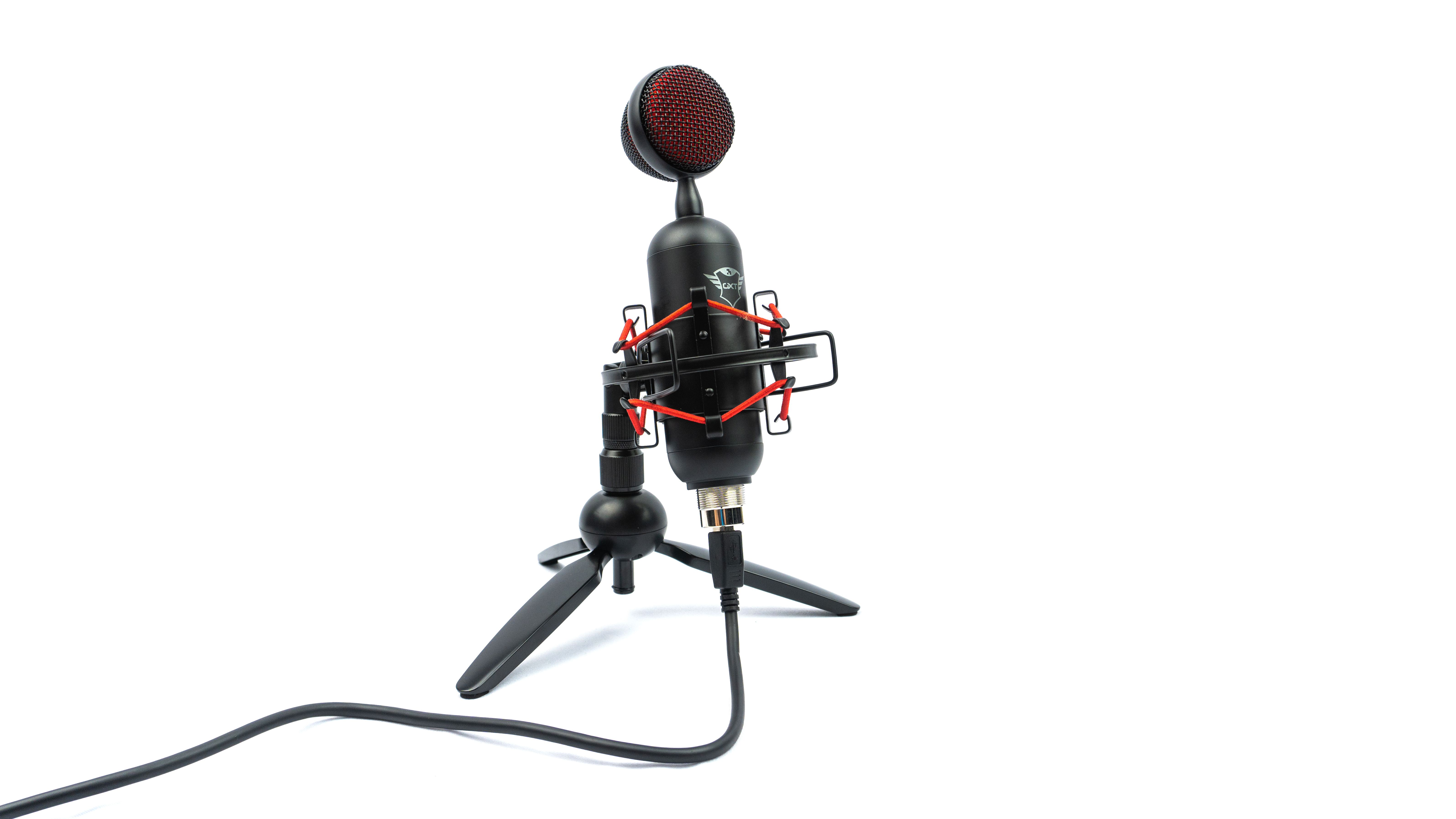 Отложим комплектацию в сторону и перейдем к микрофону. Размеры Trust BUZZ 285 мм в высоту, 205 мм в ширину и глубину. Сам микрофон весит 282г, вес без подставки позволяет носить его в руке без дискомфорта. В руке он ощущается так же солидно за счет металлического корпуса. Корпус микрофона с дугами и решеткой капсюля покрыт матовой фактурной краской. Из декоративных элементов тут имеется серый логотип GXT по центру микрофона и красный цвет внутренней части капсюля.