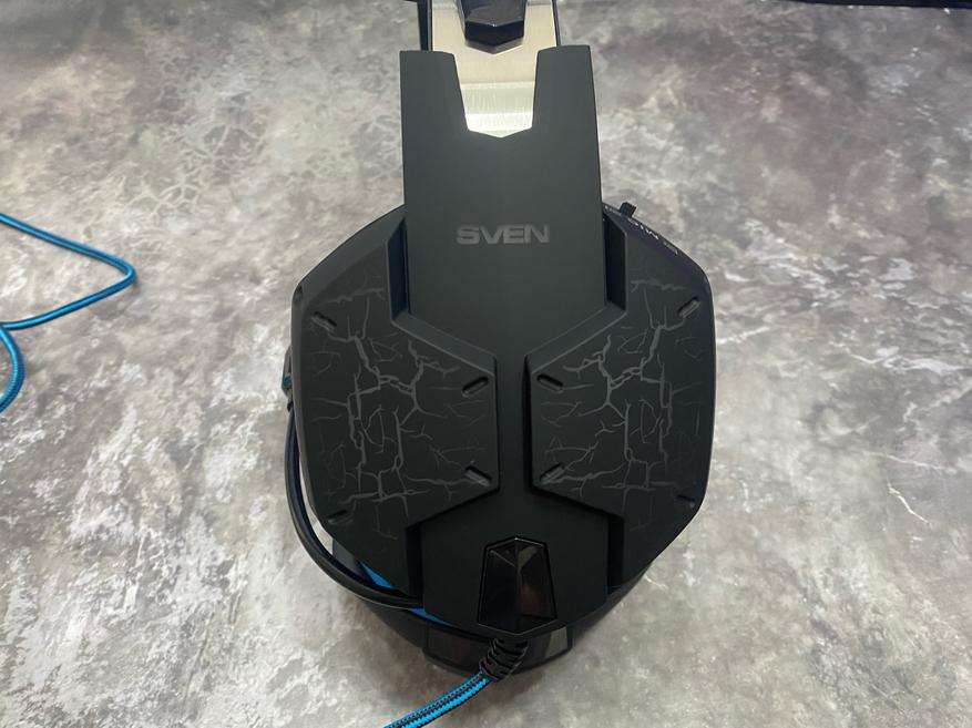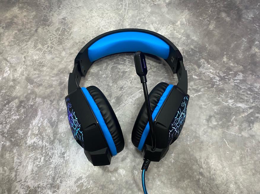 Если говорить о внешнем виде, то гарнитура выглядит хоть и не в премиальном стиле, но со вкусом. Для подчеркивания внешнего вида гарнитура оснащена светодиодной подсветкой с переливающим эффектом. Гарнитура выполнена в 2 основных черно-синих оттенках. Корпус наушников полностью пластиковый, но внутренний каркас оголовья сделан из металла. Амбушюры выполнены из эко-кожи, что в свою очередь придает наушникам более дорогой вид. Внутренний поролон амбушюр полностью справляется со своей задачей в обеспечении комфортного размещения на ушных раковинах, что можно определенно назвать плюсом. Для обеспечения комфортного размещения гарнитуры на голове можно отрегулировать размер оголовья с двух сторон, также для удобного размещения на верхней части оголовья присутствует мягкая вставка, благодаря которой даже при длительном использовании гарнитуры дискомфорта не будет. На левой чаше установлен несъемный микрофон с чувствительностью -58 dB и также на левой стороне разместился переключатель для обеспечения отключения микрофона при необходимости. Подключение гарнитуры проводное по USB, кабель выполнен в синем цвете и имеет защитную тканевую оплетку. Длина кабеля 2,2 метра, что, на мой взгляд, даже больше чем нужно для комфортного использования гарнитуры. На правую сторону производитель разместил — колесико регулировки громкости.