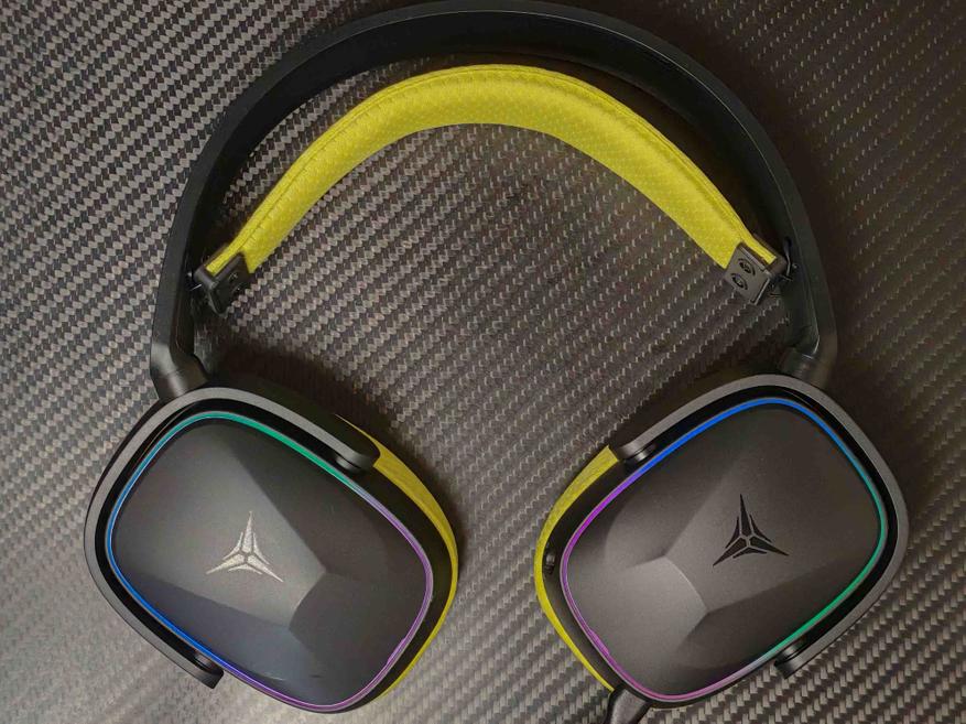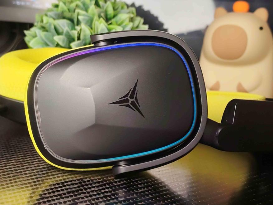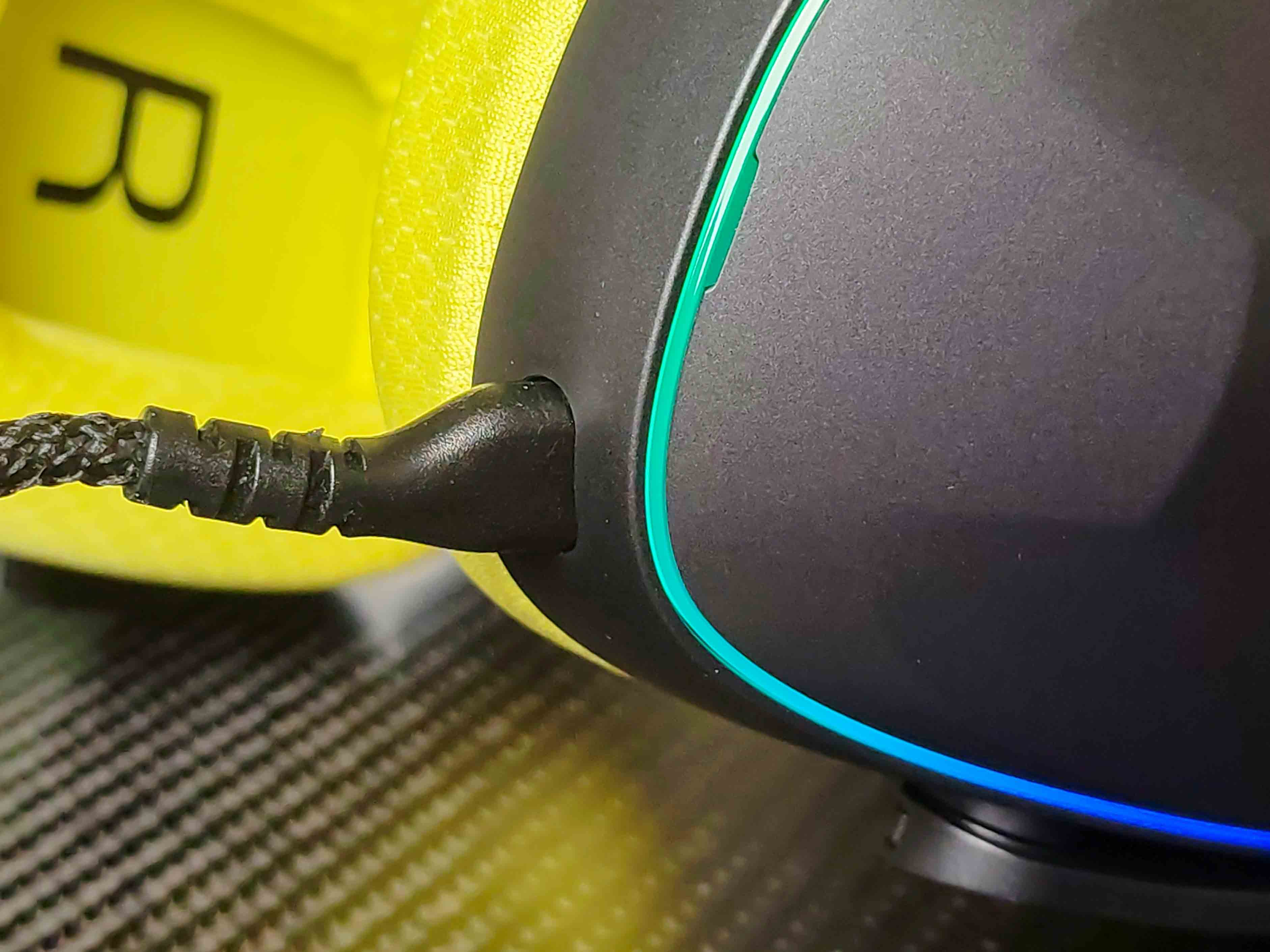 На самих наушниках нет ни одного элемента управления, лишь вход под микрофон с замком для фиксации и крепление кабеля. Подсветка на чашах симпатичная, анимированная, но настроить ее нельзя, только выключить, что я и сделал.