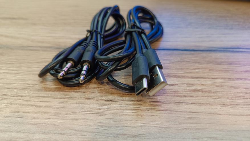 В комплекте поставки присутствуют уже стандартные провода AUX MiniJack (3,5мм) — MiniJack (3,5мм) длиной более 1 м и провод зарядки с USB Type-C длиной 1 м.