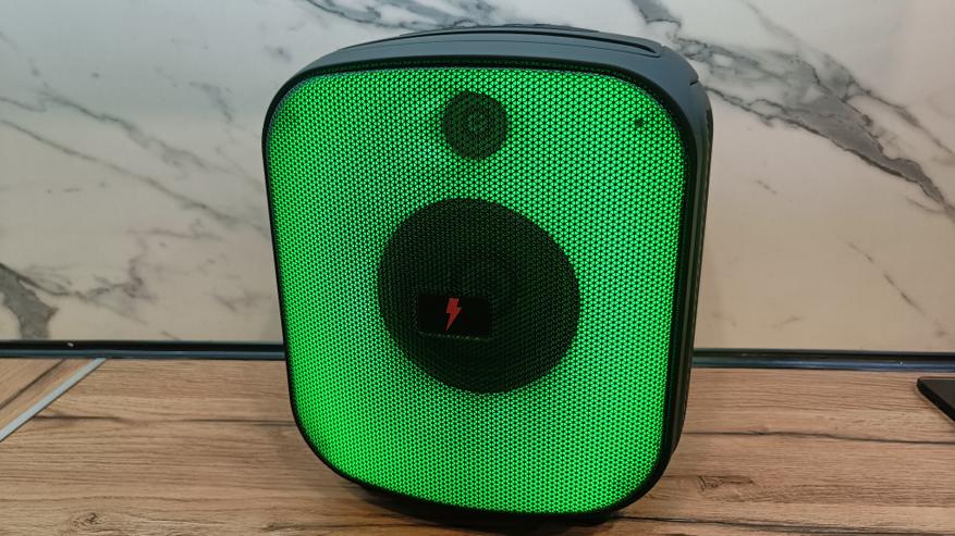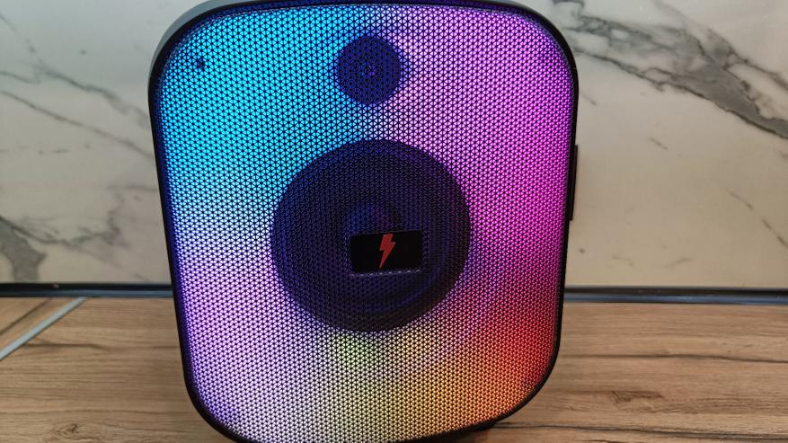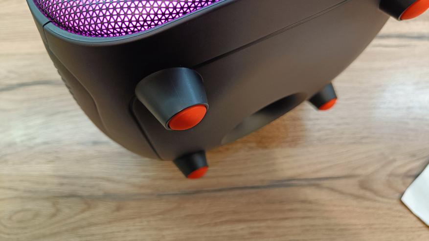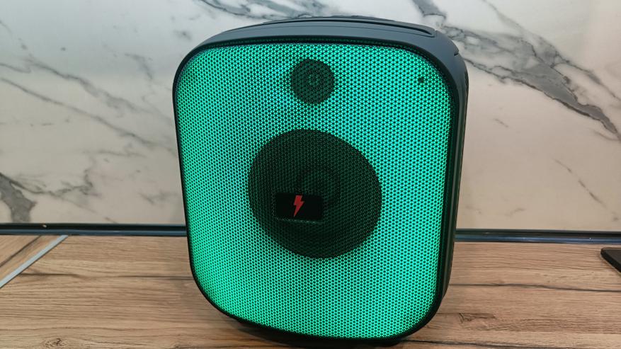 Заявленная автономность в 10 часов достигается при средней громкости и выключенной подсветке. Заявленные часы колонка у меня не отыграла, а сдалась на 8,5 часов. Даже эти показания вполне неплохо. А на максимальной громкости колонка продержится не более 4,5 часов. При наличии такого объемного корпуса внутрь можно было бы поставить еще пару аккумуляторов для увеличения емкости.