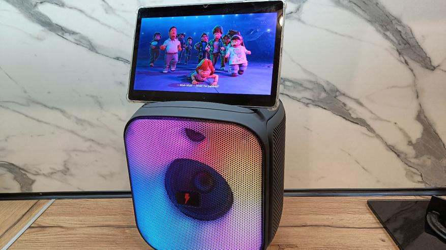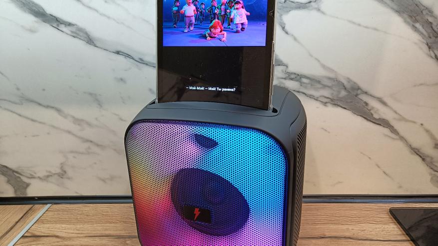 Вырез можно использовать для установки планшета или смартфона, а, подключившись к колонке, можно получить мощную базу для просмотра фильмов или видеороликов. На колонке установлен планшет с диагональю более 10 дюймов, и он прекрасно удерживается. Смартфон будет стоять еще лучше.