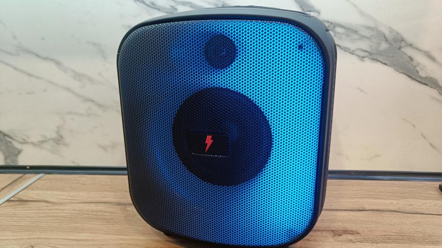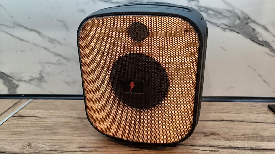 На лицевой части под металлическим грилем размещаются 2 динамика диагональю 133 и 38 мм. Можно их логически разделить на излучатели высокой и низкой частоты. Вокруг динамиков размещается матовая поверхность, которая имеет внутреннюю RGB подсветку. Во время работы можно выставить необходимый режим подсветки или выключить вовсе.