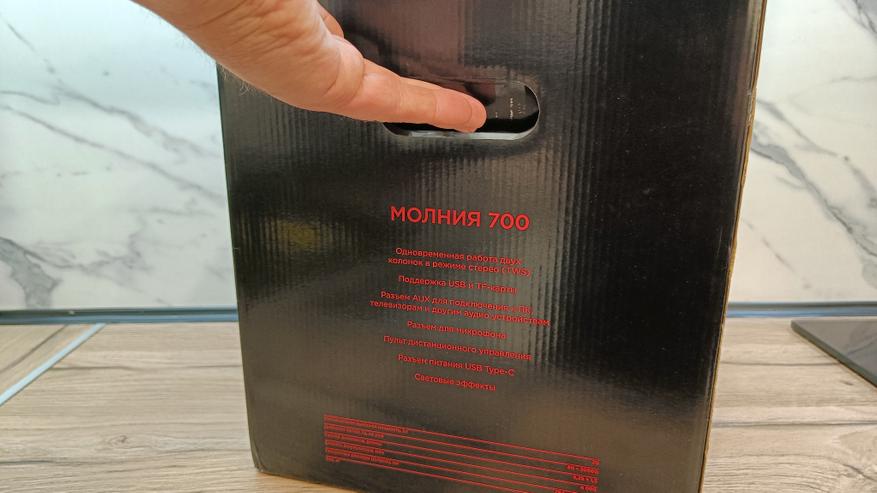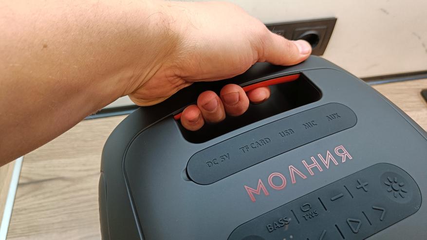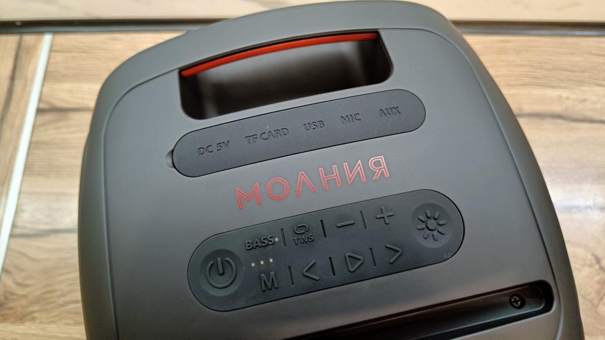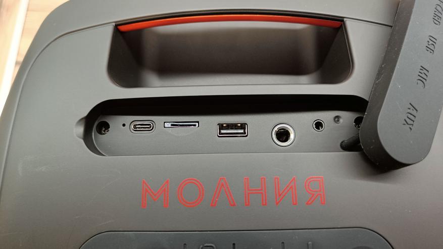 Колонка выполнена в квадратном корпусе со скругленными углами. Крайне редко встречается такой стиль исполнения. Все же колонки обычно бывают более вытянутые или прямоугольные, но «Молния 700» напоминает мне комбик для акустической гитары. В верхней части выведены все интерфейсы подключения. Они дополнительно прикрыты резиновой заглушкой, оберегающей от пыли и влаги. Хотя производитель не раскрывает степень защиты. Рядом размещаются кнопки управления, которые установлены под резиновой накладкой. Между ними логотип серии «молния» в красном цвете. А еще тут есть ручка для переноски и небольшой вырез для установки различных гаджетов. Хотя это лично мои наблюдения.
