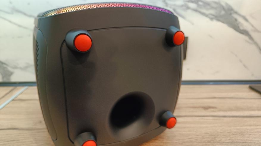 Нижняя часть колонки возвышается над поверхностью за счет высоких ножек. Они пластиковые, но есть резиновые накладки оранжевого цвета. Вынос колонки чуть выше предназначен в связи с выходом фазонвертора вниз. И если бы колонка была вровень со столом, то пользы от него было бы немного. Диаметр фазоинвертора примерно 65-70 мм.