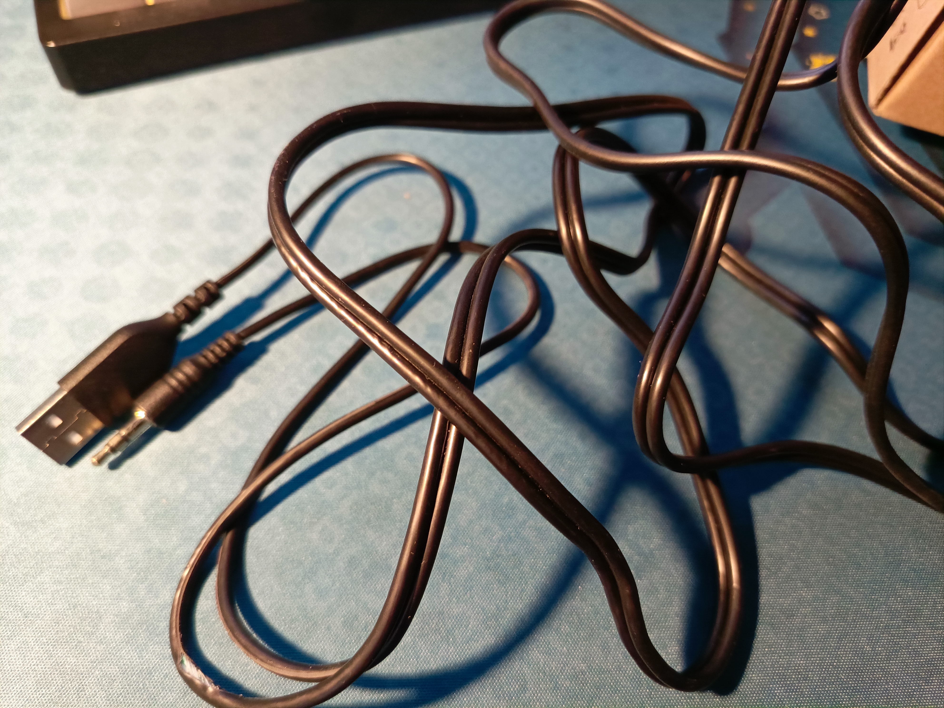 Колонки подключаются с помощью провода длиной 170 см. На конце установлен USB-A разъем, который отвечает за питание, а интерфейс подключения реализован через классический jack 3,5 мм. Длина провода между колонками — 130 см. Провод весьма толстый и не столь привлекательный. За эти деньги можно было бы сделать и в нейлоновой оплетке. В целом длины достаточно для комфортного расположения колонок на компьютерном столе.