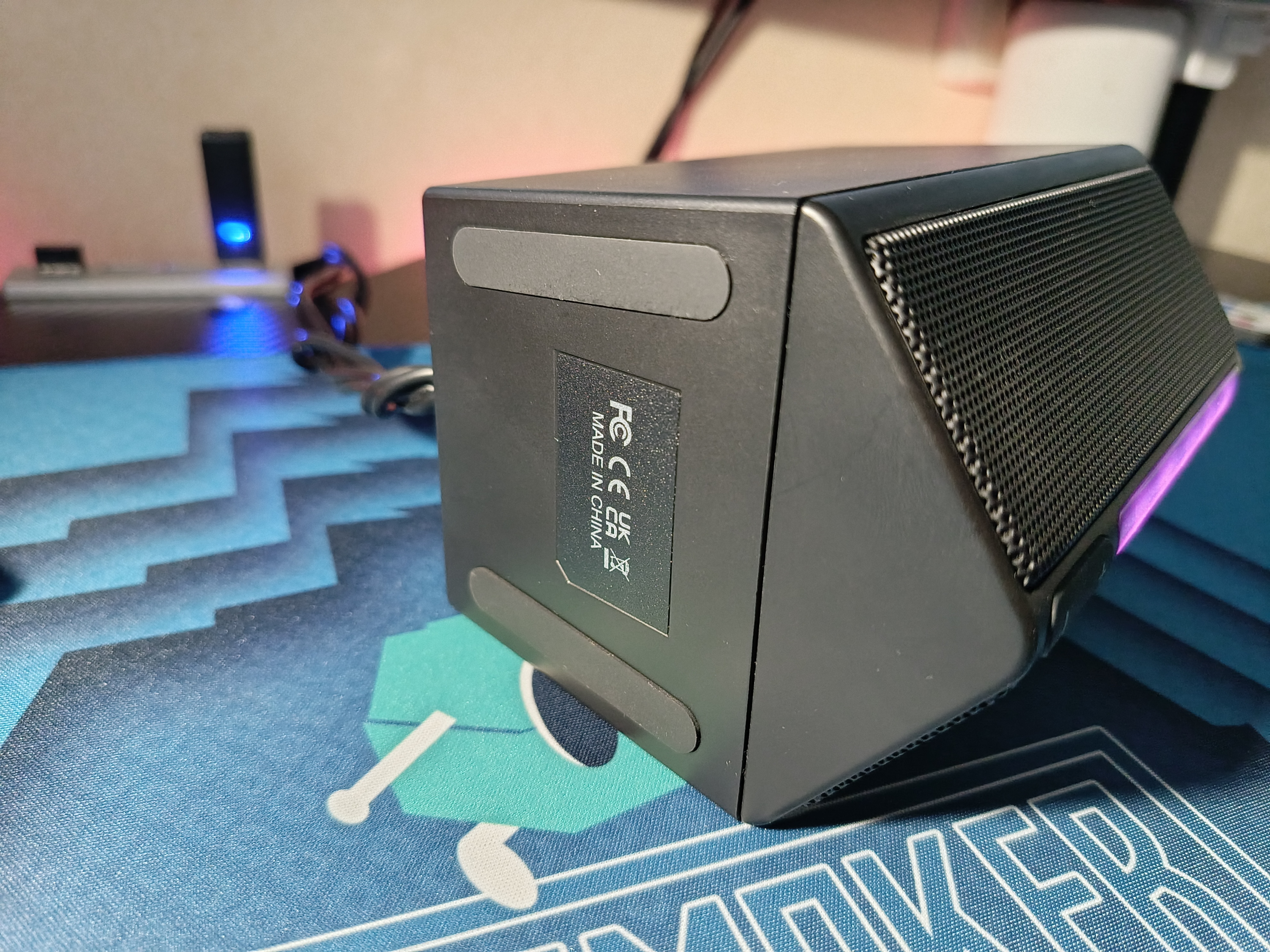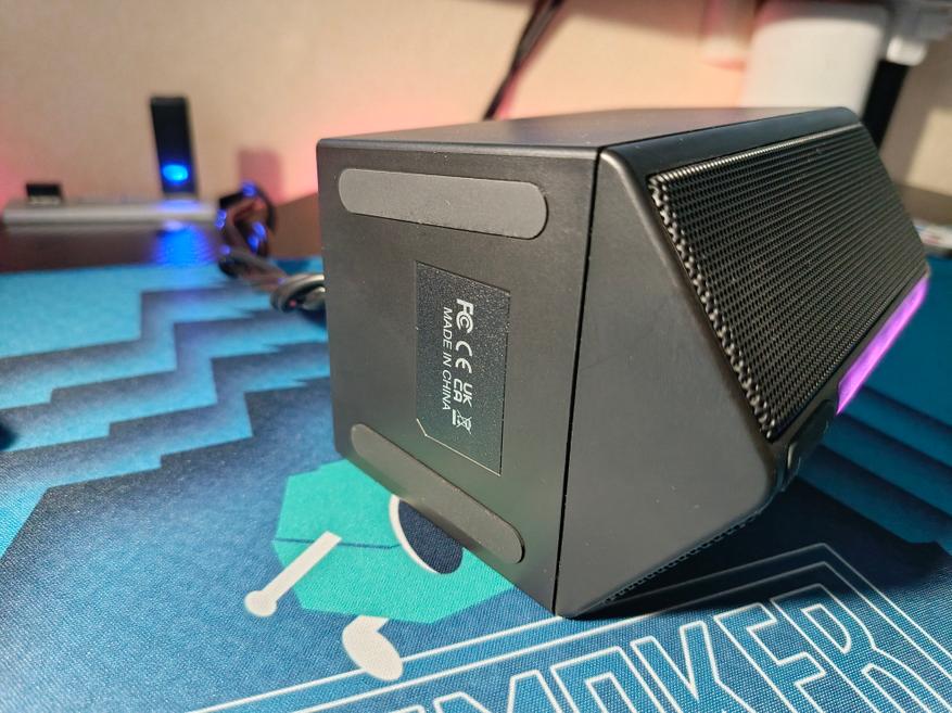 Корпус колонок изготовлен из матового немаркого пластика. На лицевой стороне находится металлическая сетка, за которой расположились динамики и RGB-подсветка. Общая мощность составляет 4 Вт, что в целом вполне достаточно для прослушивания музыки, игр и просмотра кино. В нижней части присутствуют антискользящие наклейки.