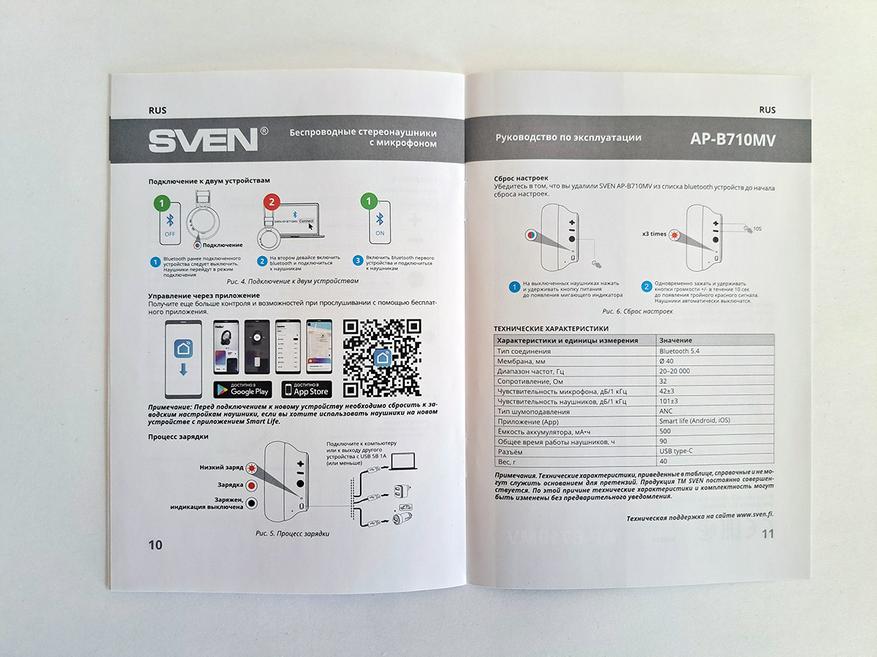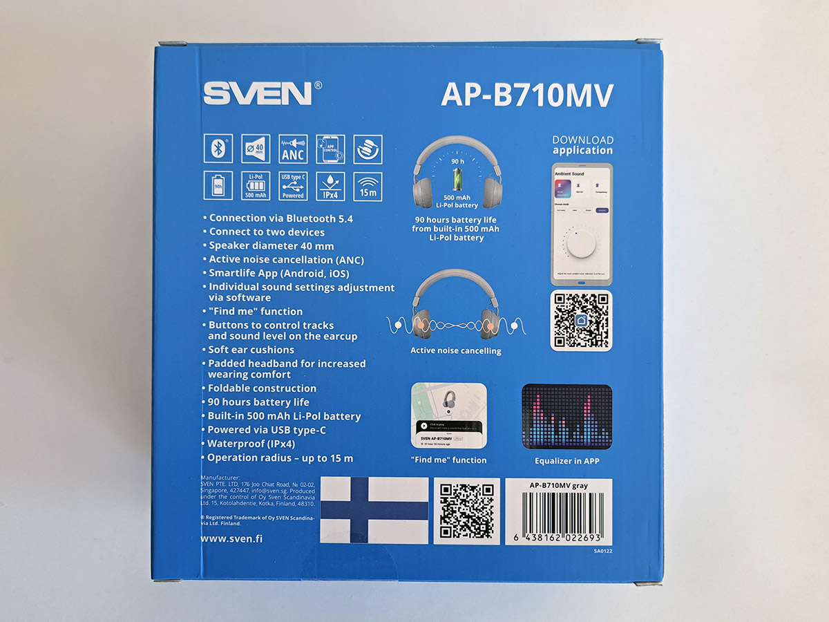Наушники упакованы в красочную коробку в фирменных цветах Sven. На обратной стороне описаны все маркетинговые преимущества. Настоятельно рекомендую скачать приложение по QR коду.