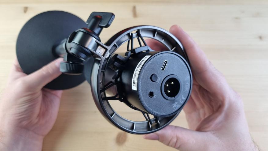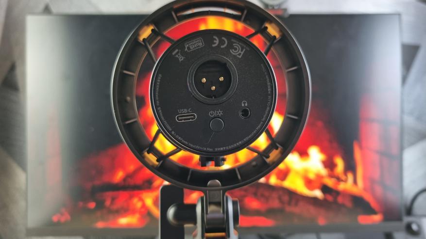Снизу же имеем Type C порт для проводного подключения и зарядки, XLR для соответствующей коммутации, выход на наушники и кнопку включения, совмещенную с выбором режима свечения.