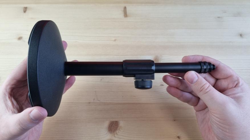 Стоя на столе, микрофон смотрит мне не в рот, а в глаз. Поднимается же конструкция примерно до уровня лба.