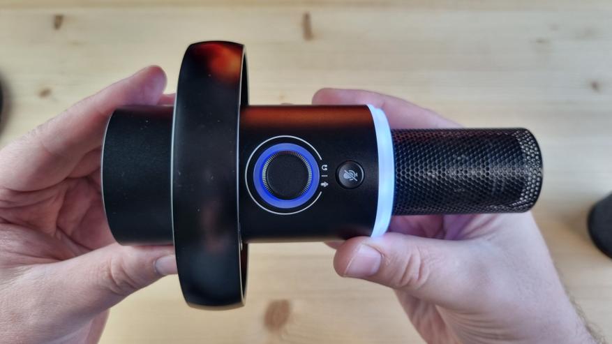 Ниже идет светодиодное кольцо, оно может гореть, светиться и «дышать» разными цветами, ну и венчает творение — металлический цилиндр с кнопкой «mute», ещё одним светодиодным кольцом и многофункциональным регулятором.