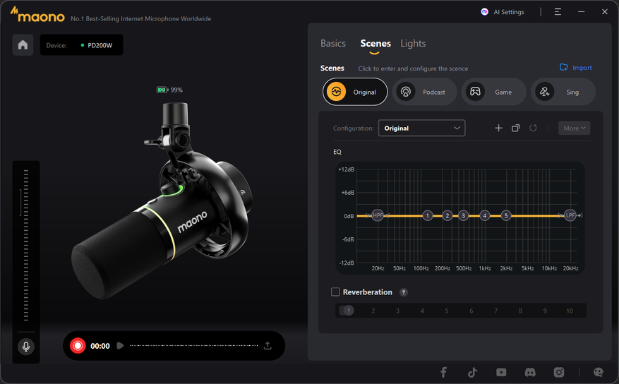 На закладке «Scenes» находятся пресеты встроенного эквалайзера с возможностью их ручной коррекции, плюс, конечно, ревербирация, если вы, например, будете играть на инструменте. Последняя закладка отвечает только за подсветку.