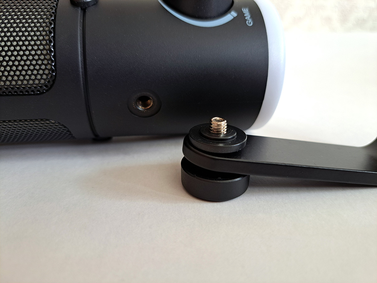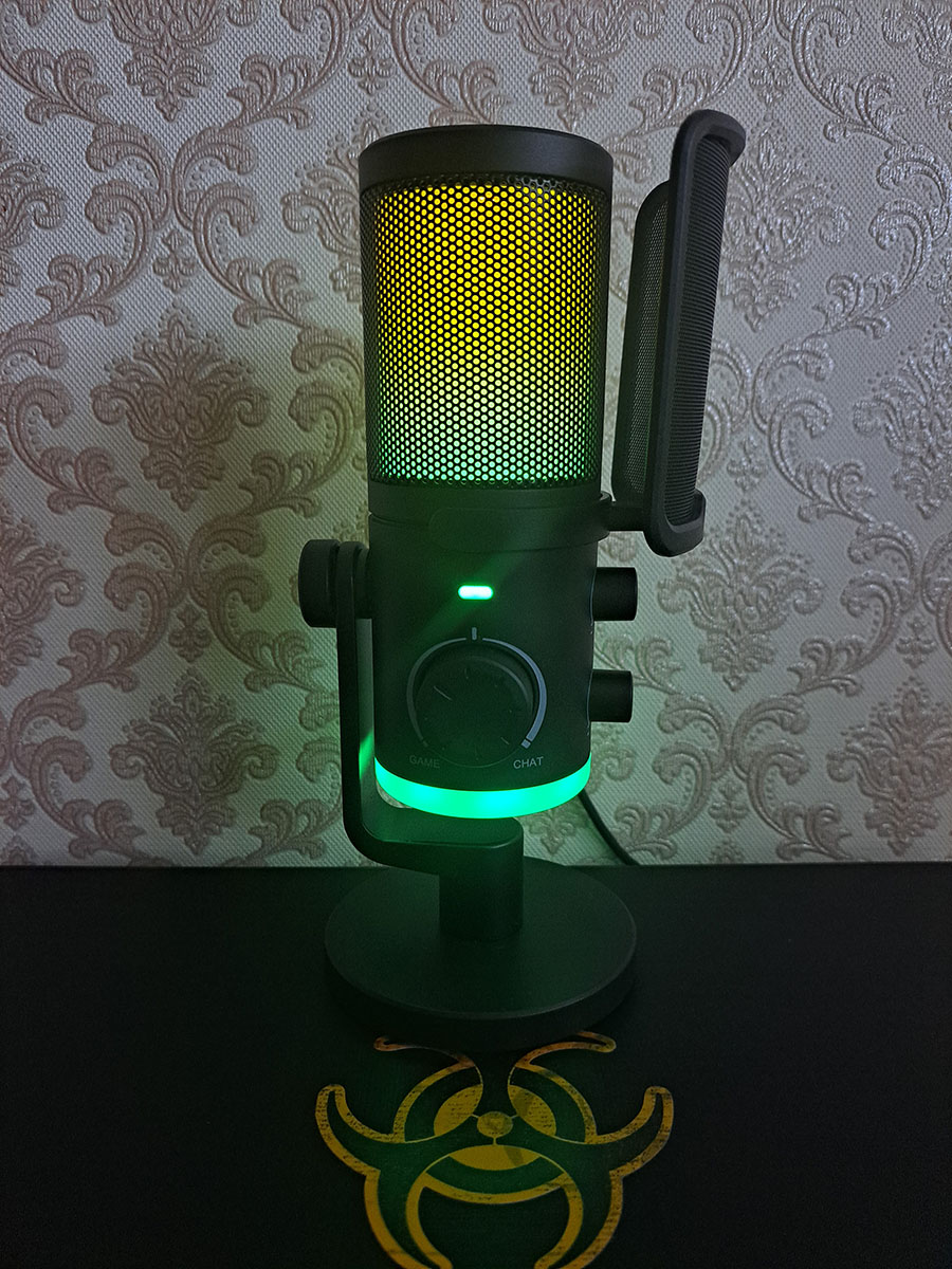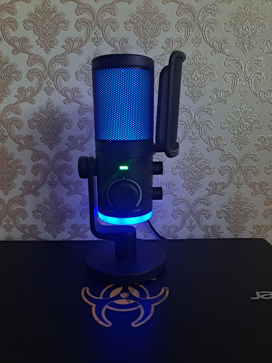 Подсветка имеется однотонная и динамическая, в области решетки и дна. Управление происходит при помощи одной кнопки. При желании, подсветку легко отключить. Кстати, на фото видно, что если наклонить микрофон в другую сторону, то шнур, торчащий из USB разъема, будет мешаться. Но обычно, такая ситуация не происходит.