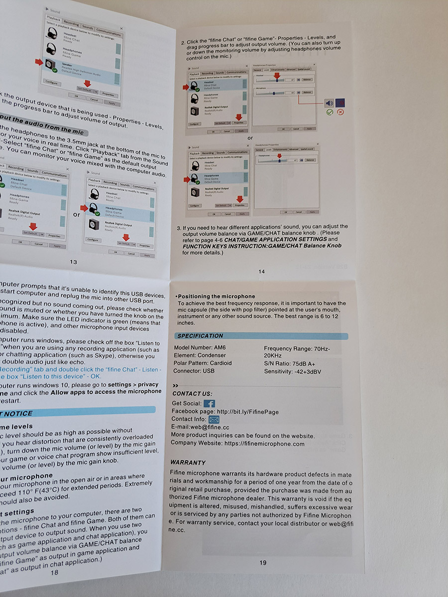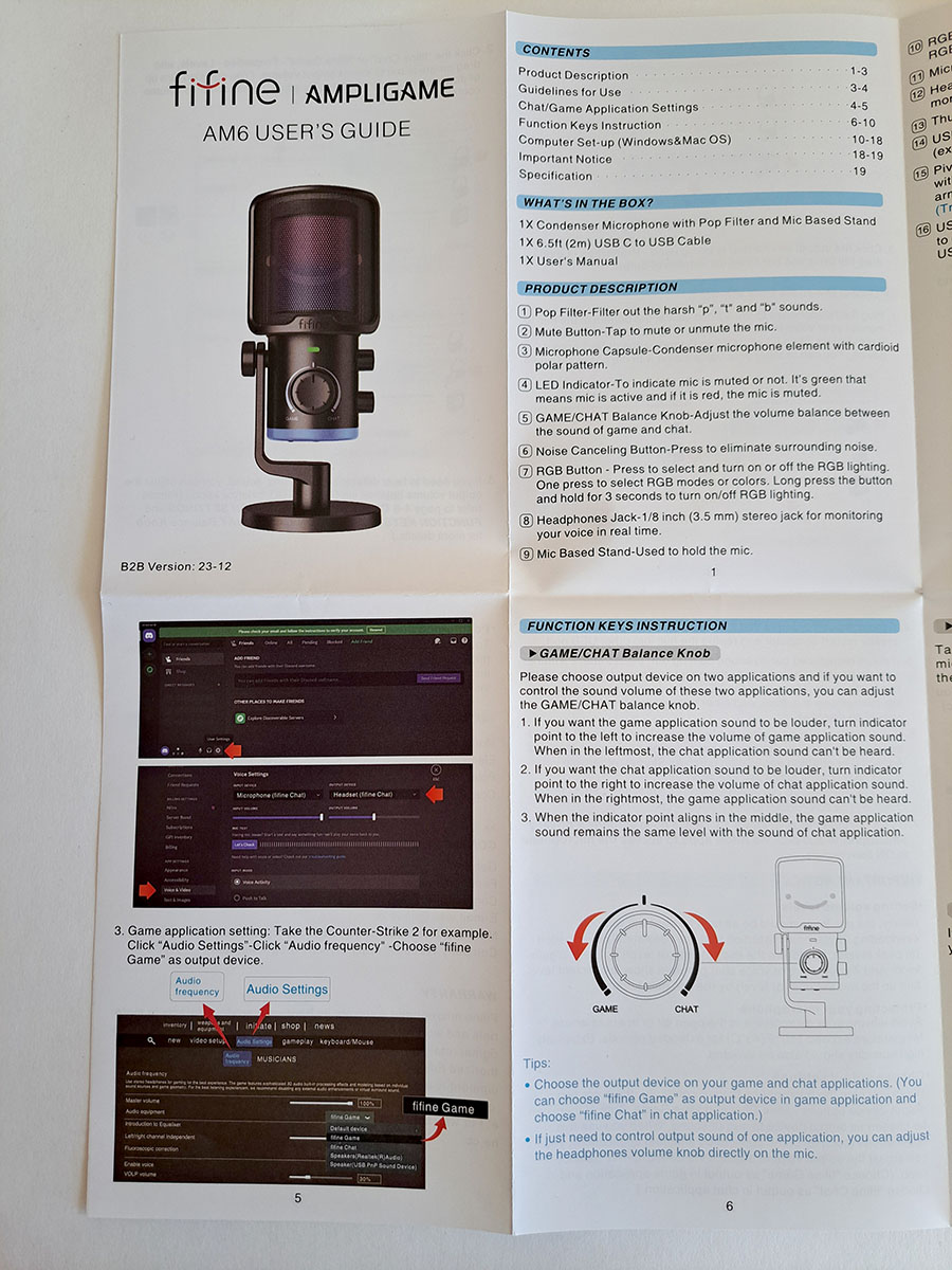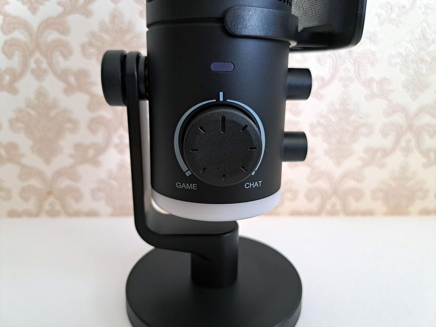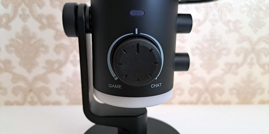 Напомню, что внутри у USB микрофонов находится звуковая карта. И поэтому они работают по принципу Plug & Play, внешняя звуковая карта и аппаратные фильтры не нужны. Fifine AmpliGame AM6 подключается к ПК как сразу два устройства ввода и вывода: fifine Chat и fifine Game, соответственно. И вот эта ручка помогает регулировать уровень громкости, или в самой игре, или в приложении, где происходит общение, например в Дискорде. То есть, выбрать баланс громкости между игрой и общением.