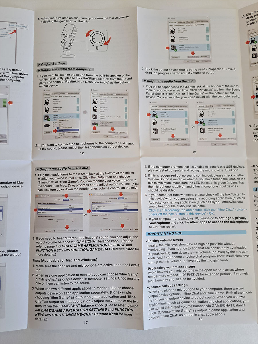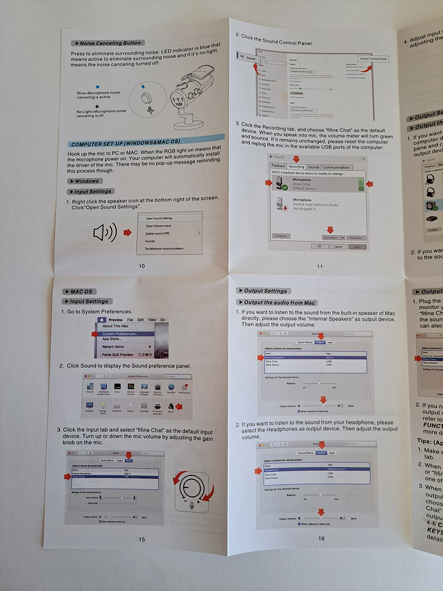 Ну, а теперь, поговорим о звуке. Как мы знаем, конденсаторные микрофоны хорошо улавливают фоновые шумы, и поэтому в неподготовленных помещениях их использование может быть не очень комфортно. Вероятно поэтому, Fifine сделал микрофон с чувствительностью — 42+3 dBV и чтобы вас хорошо было слышно, нужно размещаться близко в микрофону, говорить буквально на расстоянии 5-10 см. С комплектной подставкой не всегда это удобно делать, и тут надо подумать о монтаже на стойке или пантографе. Если соблюдать это условие, то звук для записи речи или трансляций вполне хорош. Разборчивый, с низким уровнем шумов. Как у большинства USB микрофонов, звук по умолчанию обрабатывается, в данном случае идет обрезка нижних частот, чтобы не было эффекта «бубнежа». Работа встроенного шумодава мне не понравилась, лучше использовать его только в крайнем случае, при очень шумной окружающей обстановке.