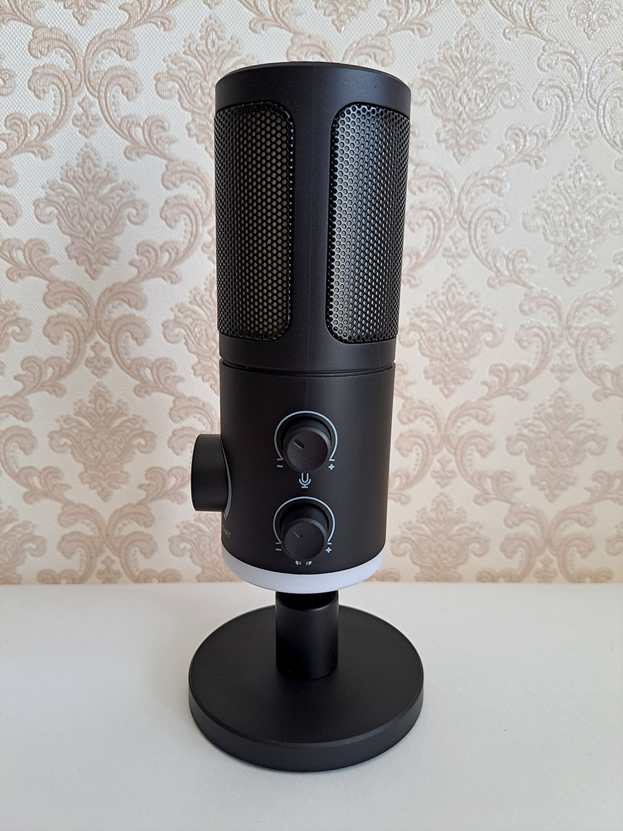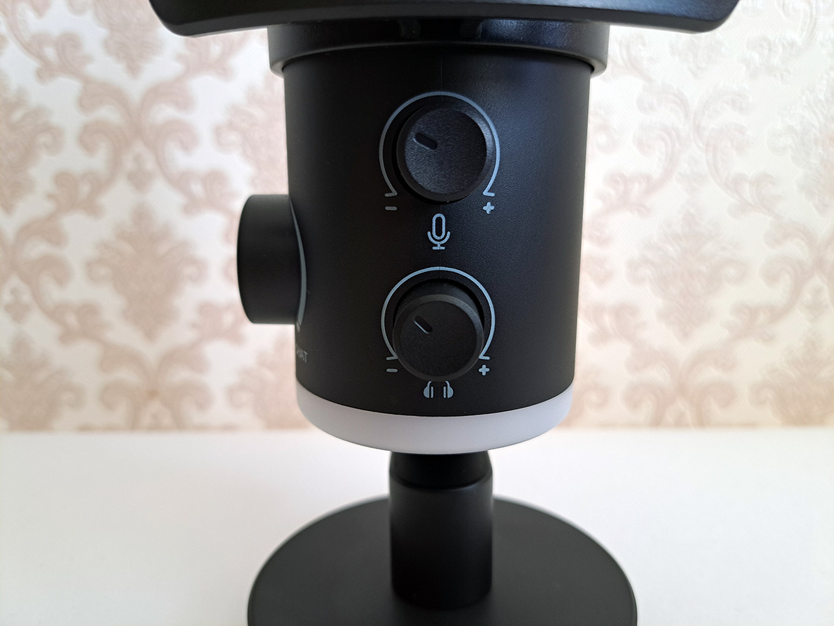 Так как, к микрофону для мониторинга звука можно подключить проводные наушники, то присутствуют отдельные ручки регулировки громкости звука для самого микрофона и для наушников.