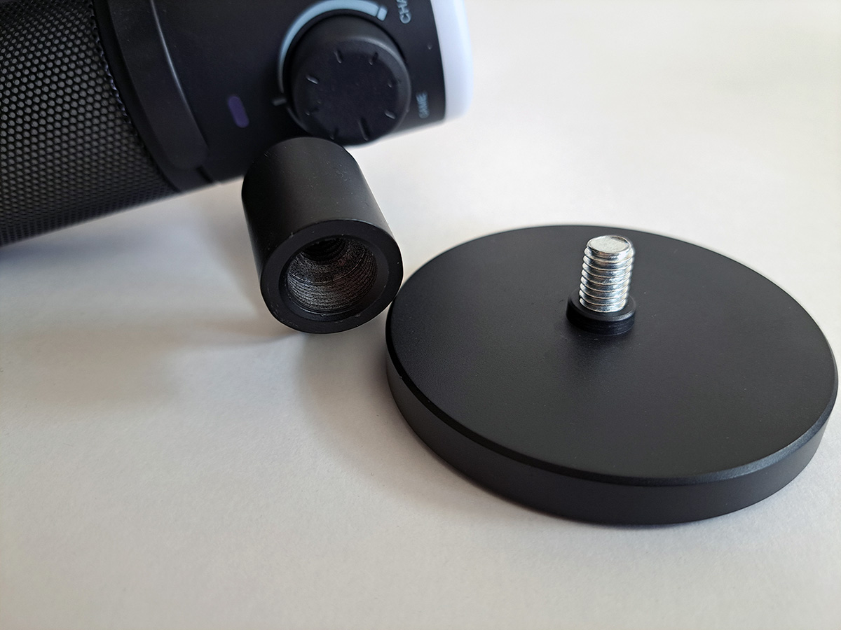 Ножка подставки из металлического сплава. Она может откручиваться, как и от основания, так и от самого микрофона. Благодаря этому, микрофон можно легко смонтировать на стойку, или на пантограф.