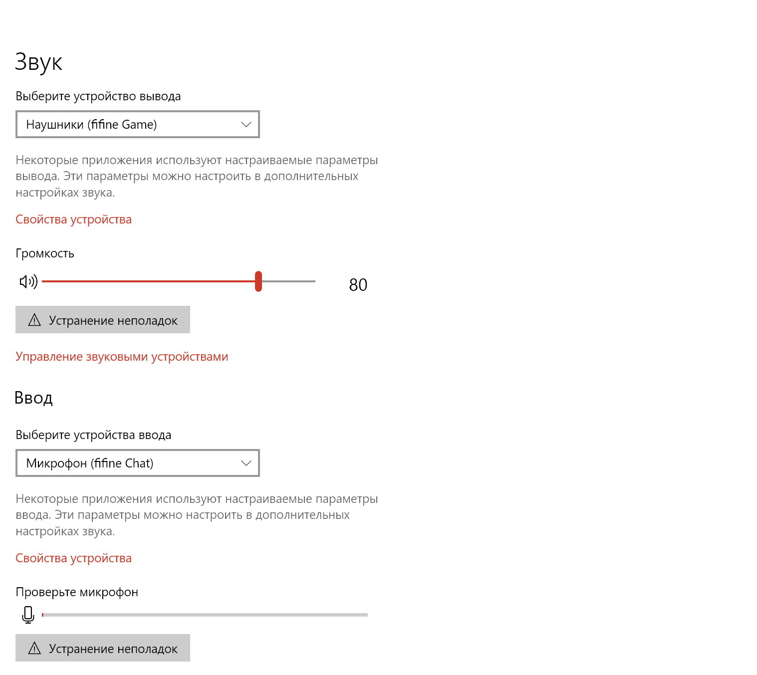 Подключаем микрофон к ПК. Win10 сразу видит два устройства fifine — ввода и вывода. Я слышал, в Win 11 были какие-то проблемы с отдельной настройкой уровня громкости. Надеюсь, сейчас их исправили.