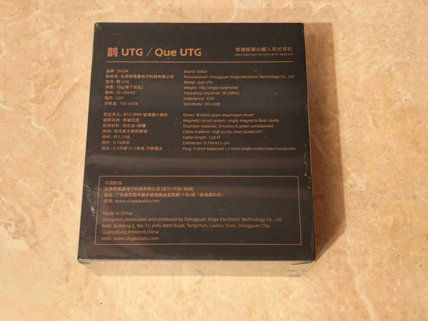 Технические характеристики SIVGA QUE UTG представлены на оборотной стороне коробки. Диафрагма динамического драйвера сделана из стекла. Его диагональ 10 мм. Абберевиатура «UTG» расшифровывается, как «ультра тонкое стекло» (ultra thin glass). Разница между простой моделью QUE и обозреваемой — в материале диафрагмы. У первых она из бериллия. Остальные характеристики стандартные для класса, тем более недорогих и качественных моделей.