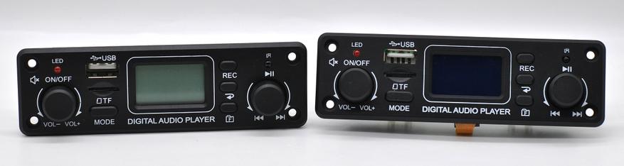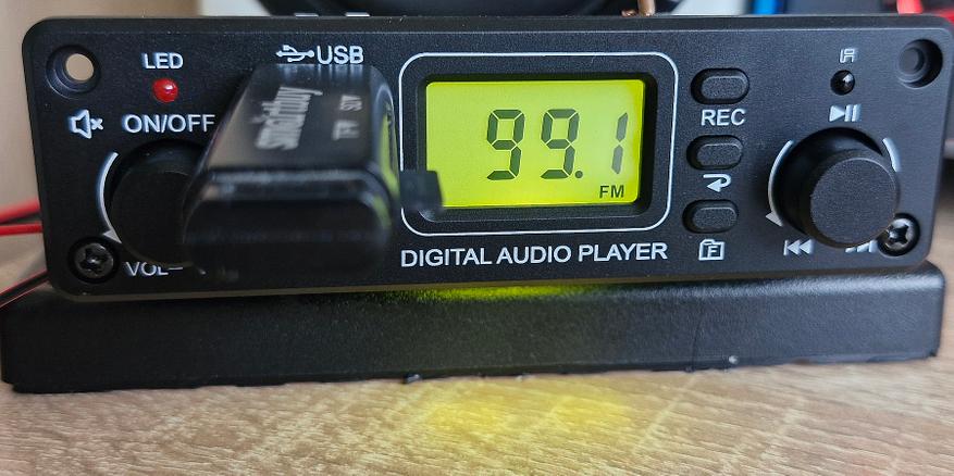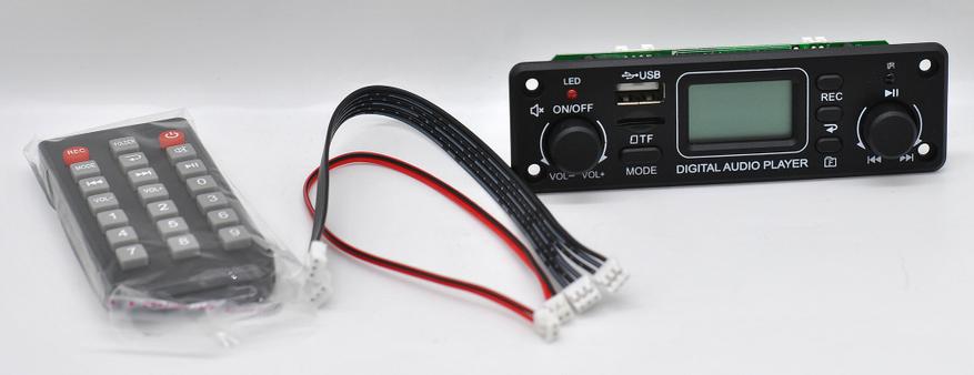 Дисплей отображает номер и время трека, частоту радиостанции. Прием FM (антенна 40 см) средний. Для носителей есть три вида воспроизведения: все, произвольно из папки и по всем папкам «рандом». Переход папок по номерам отдельной кнопкой. Не так наглядно как у TPM119B (но и модуль подороже).
