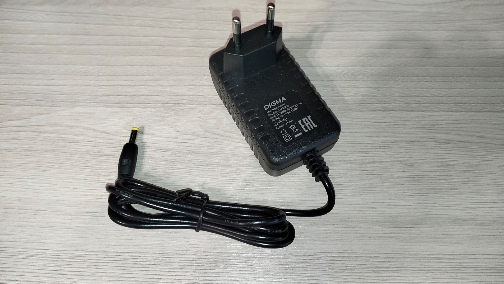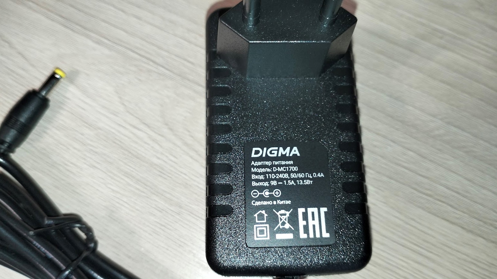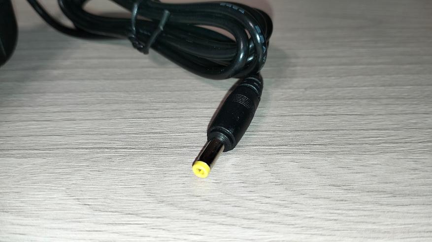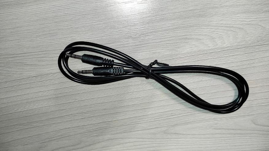 Блок питания способен выдавать 9В, 1,5А, 13,5Вт. Провод довольно длинный с круглым штекером на конце. Кабель AUX стандартный, используется также для подключения к колонке.