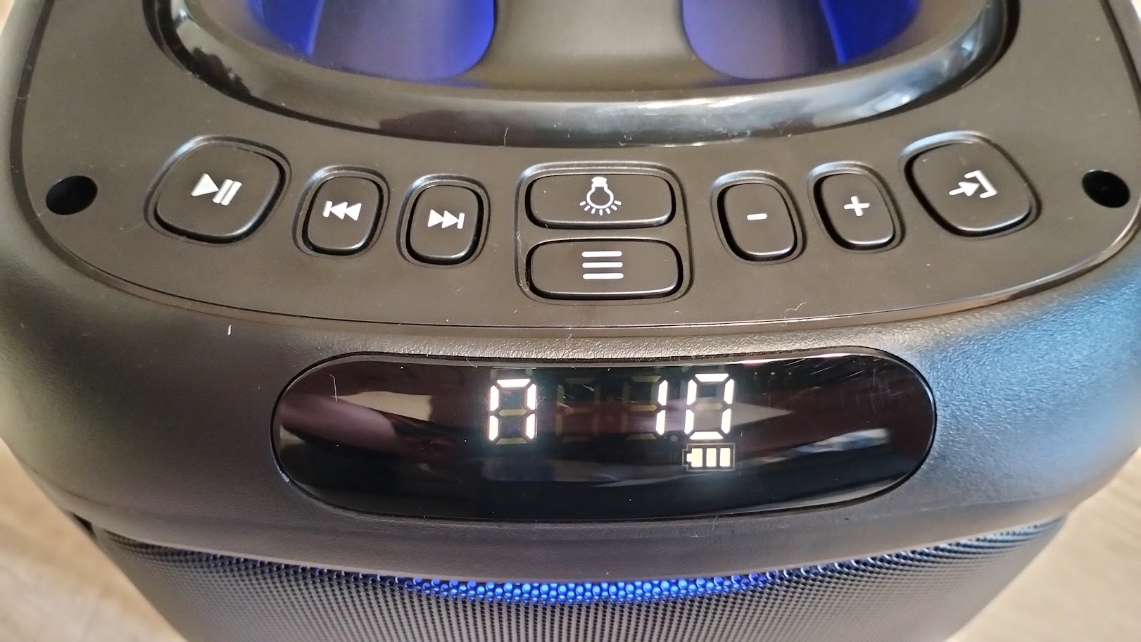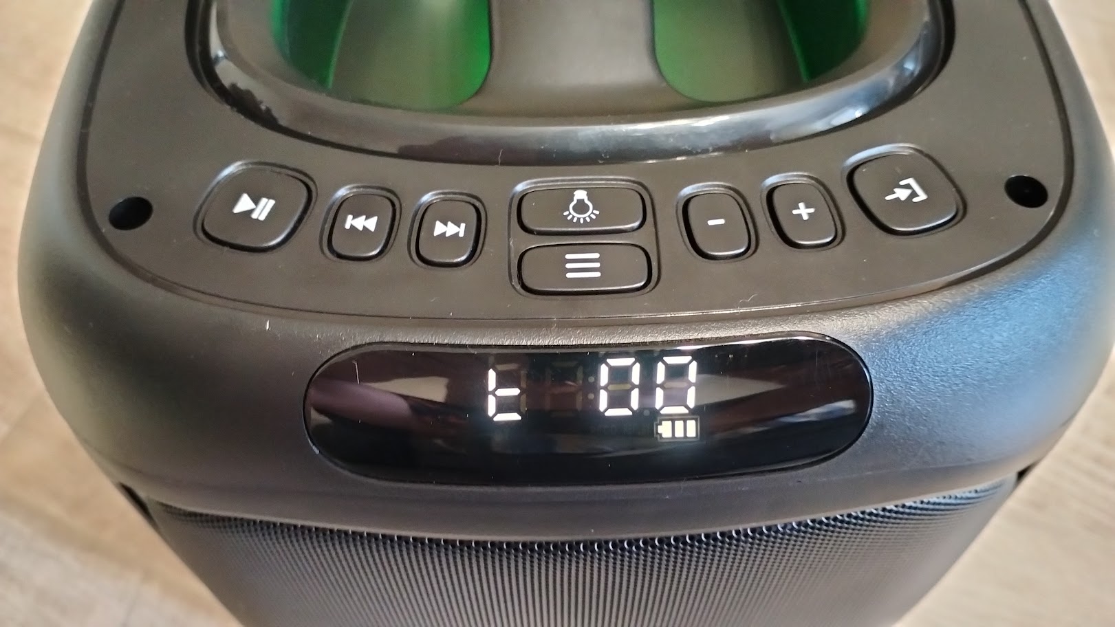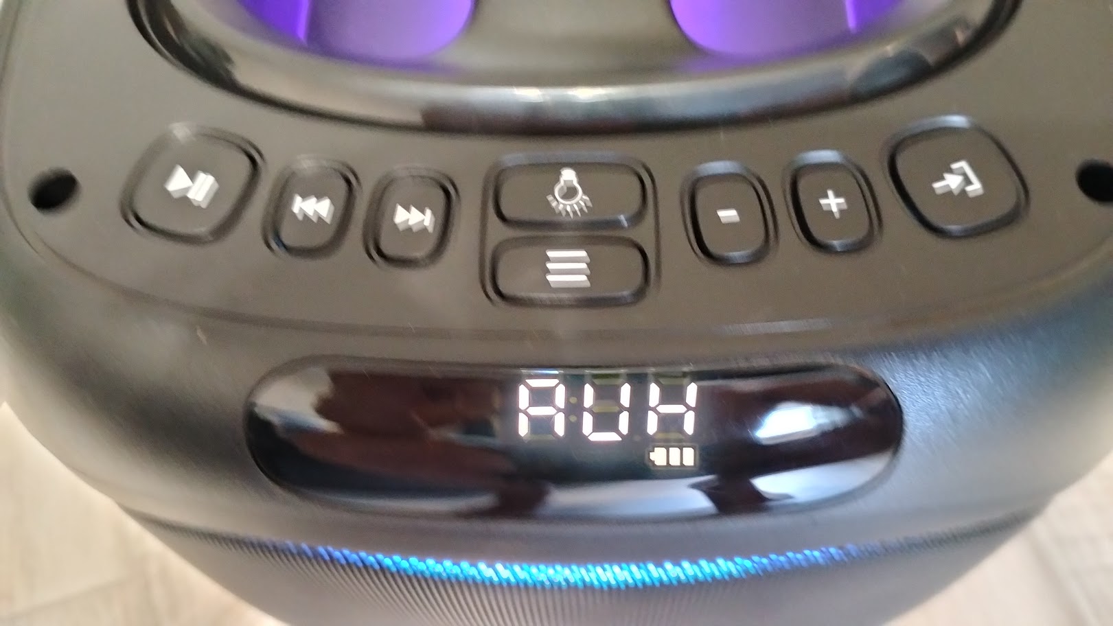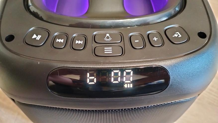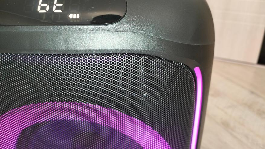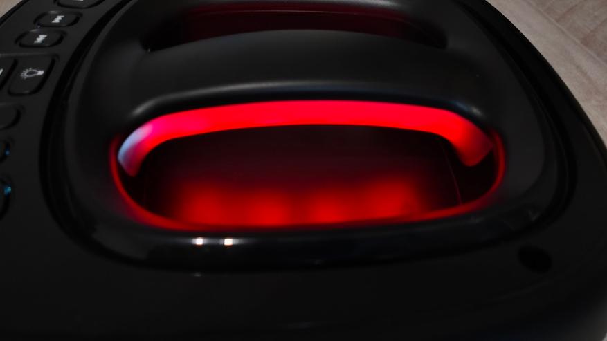 Чтобы включить колонку необходимо на задней панели переключить тумблер. Включившись сразу активируется и подсветка вокруг динамика, по бокам колонки и на ручке. Режимы можно переключать соответствующей кнопкой или и вовсе ее отключить. Подсветка довольно яркая, а цвета насыщенные, все режимы подстраиваются под проигрываемый трек.