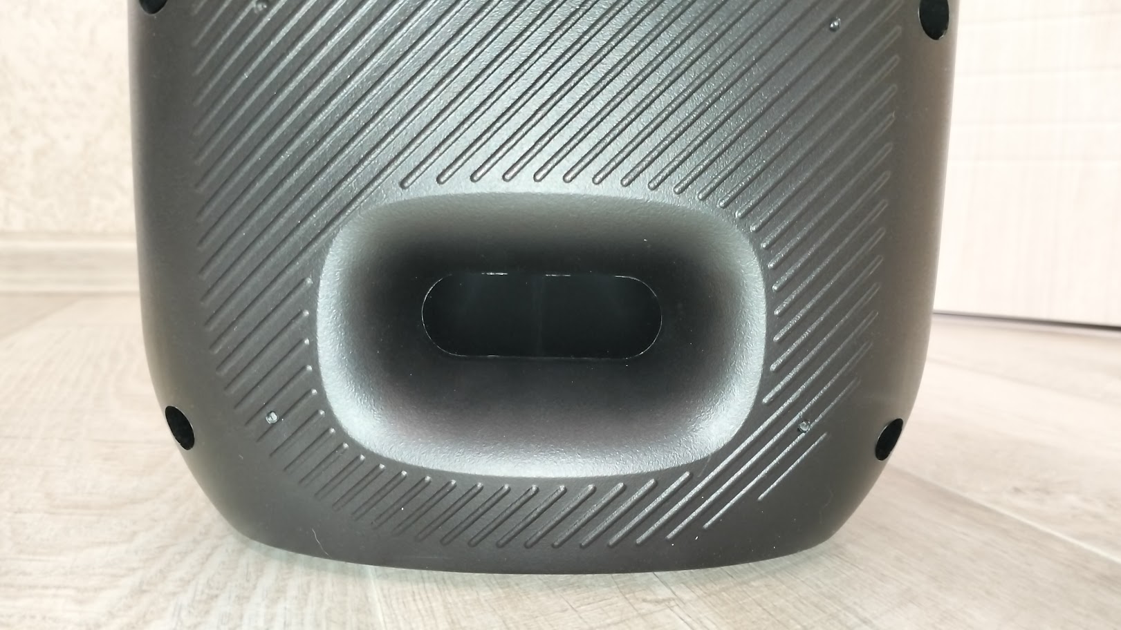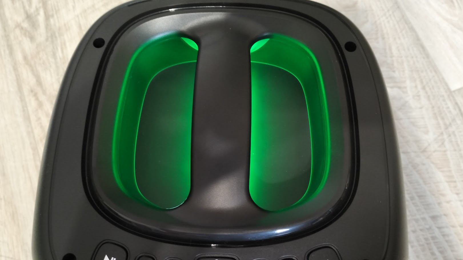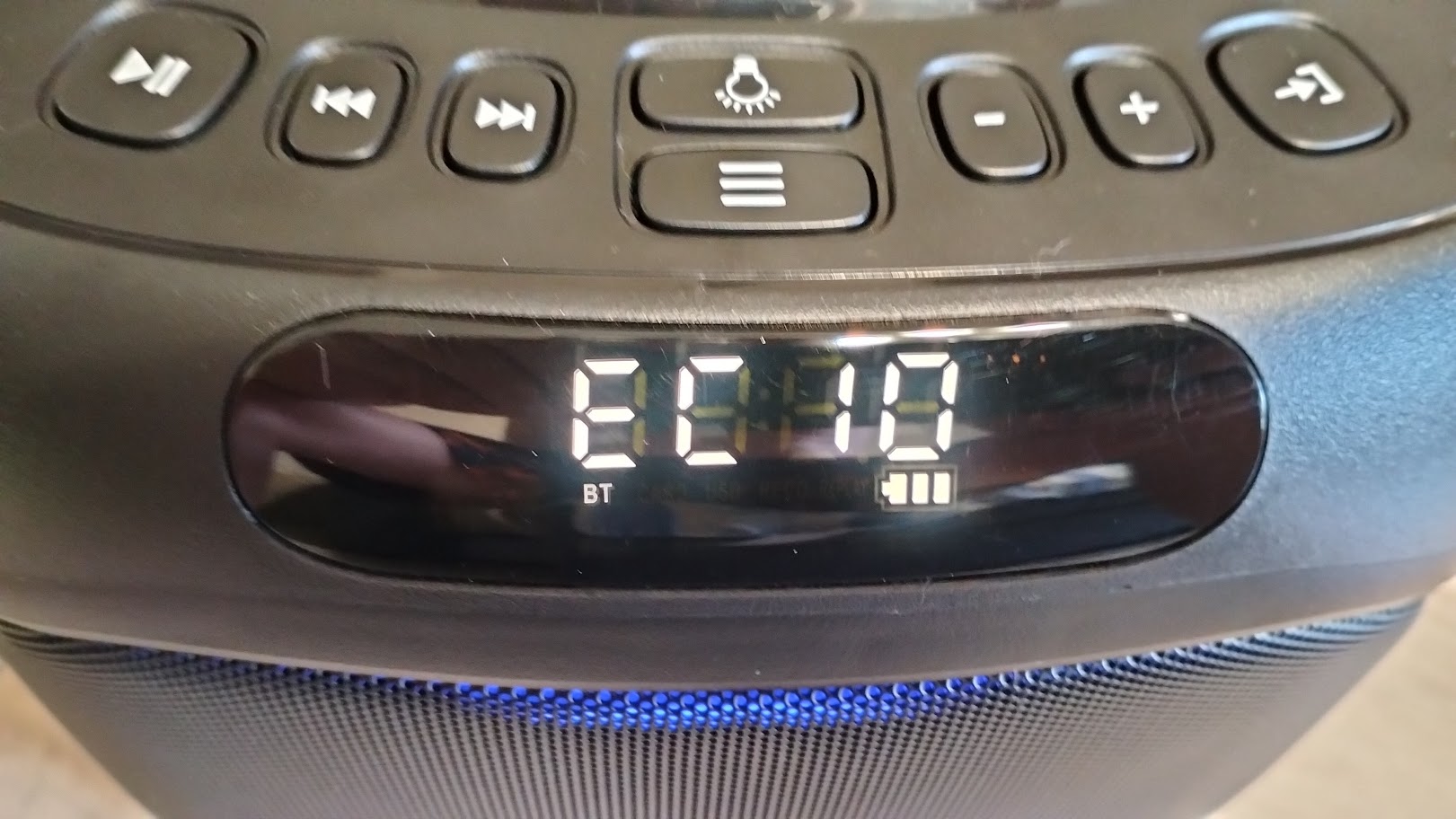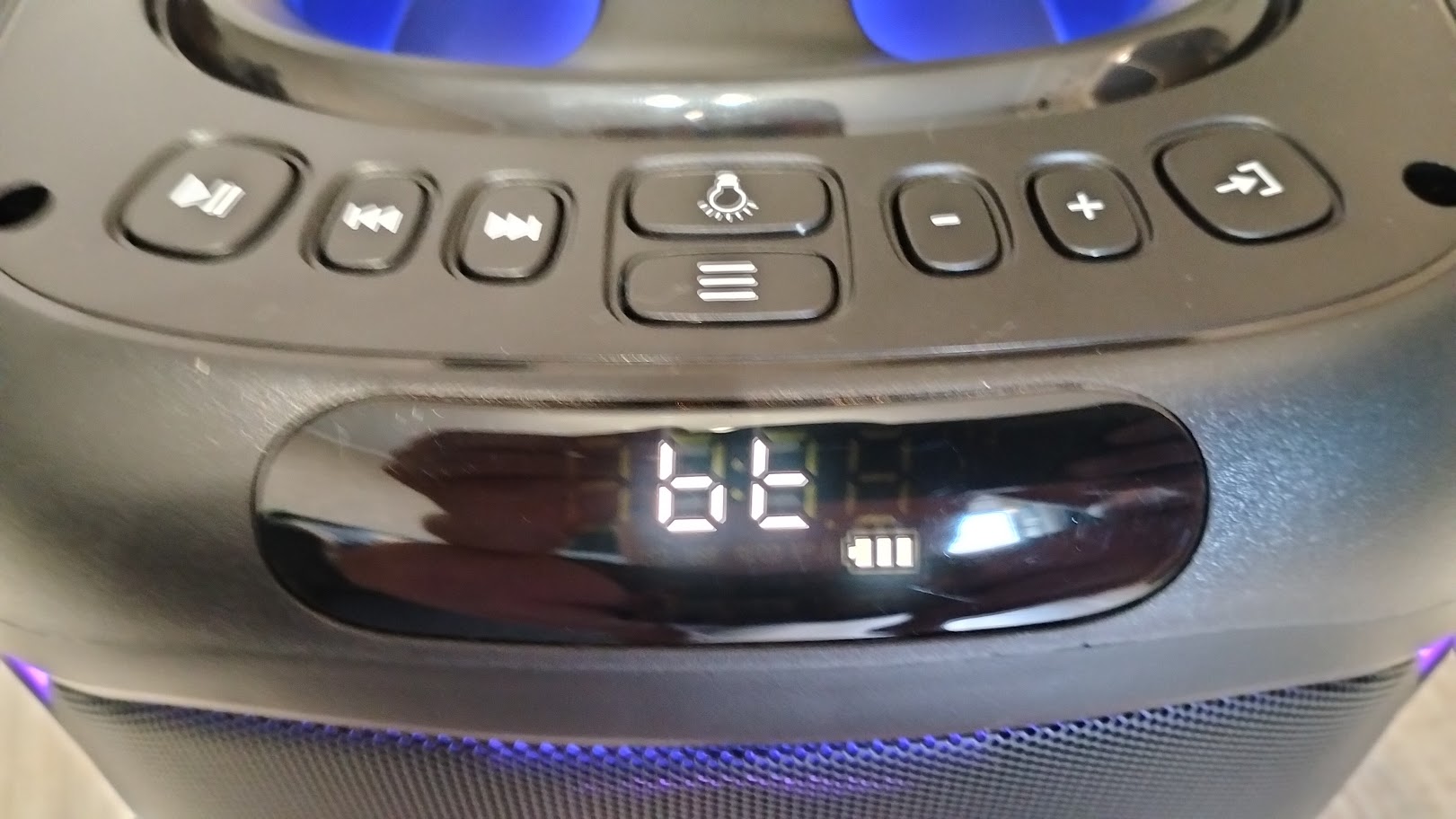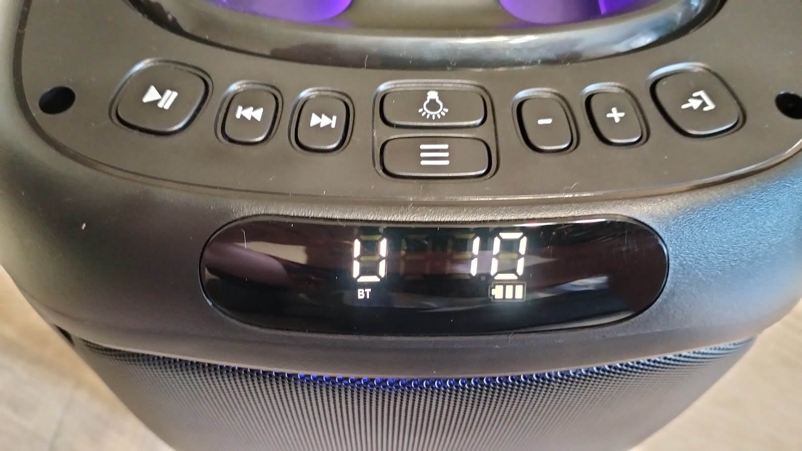 Чтобы включить колонку необходимо на задней панели переключить тумблер. Включившись сразу активируется и подсветка вокруг динамика, по бокам колонки и на ручке. Режимы можно переключать соответствующей кнопкой или и вовсе ее отключить. Подсветка довольно яркая, а цвета насыщенные, все режимы подстраиваются под проигрываемый трек.