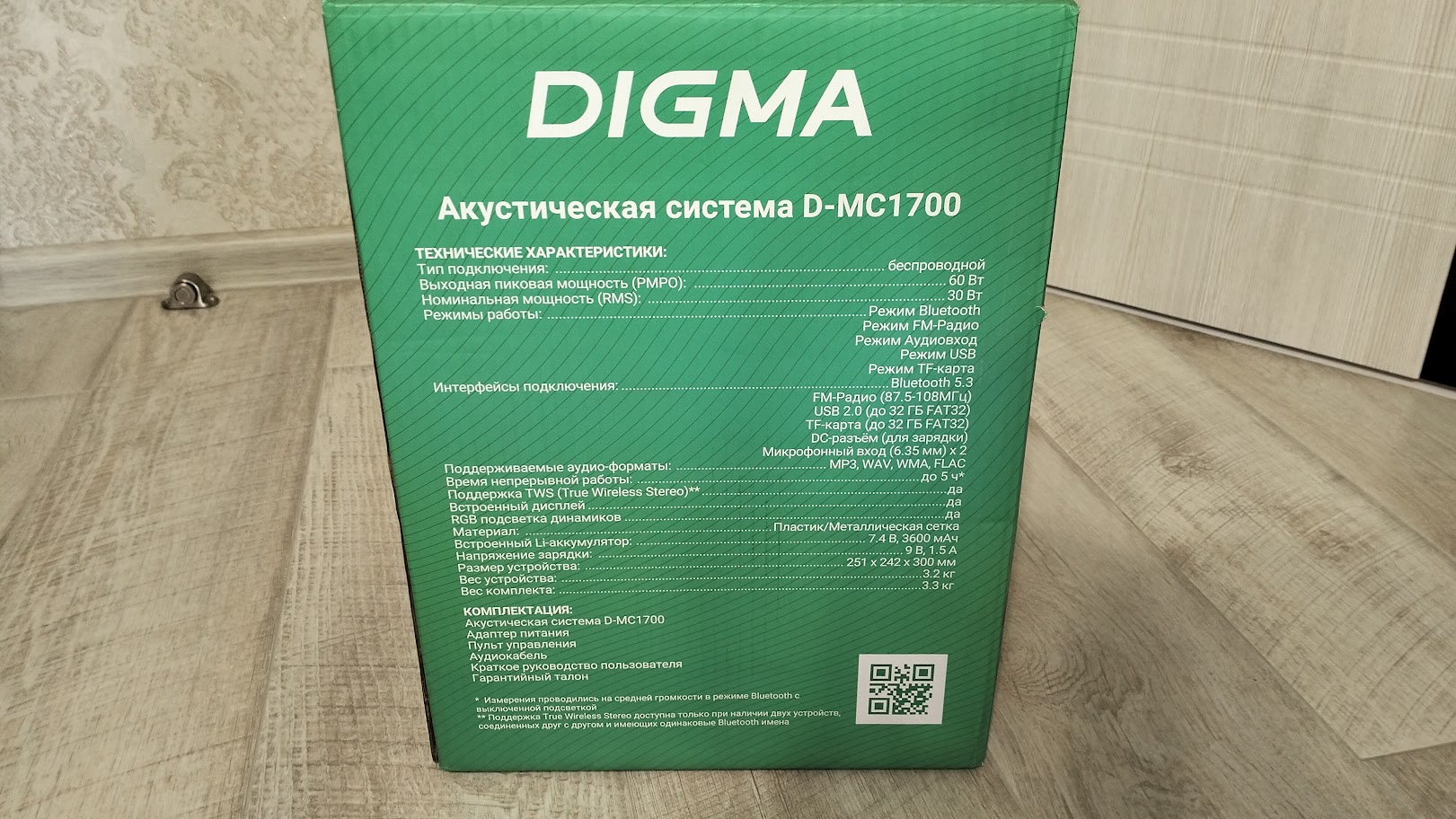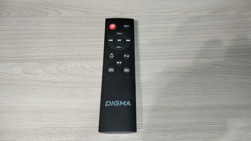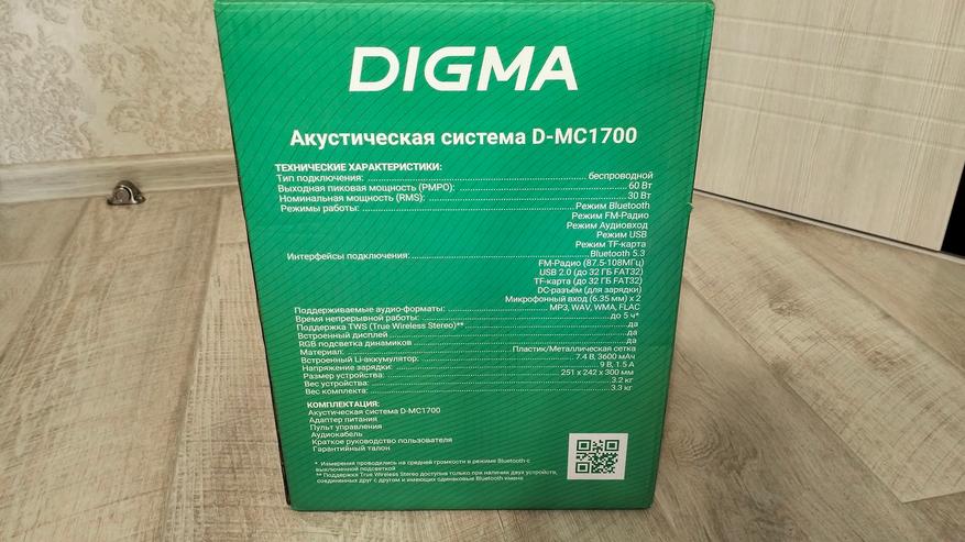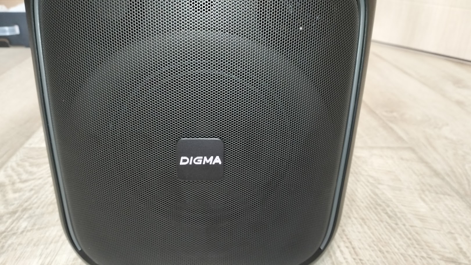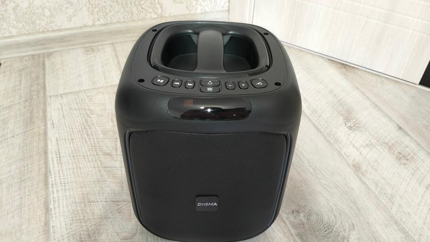 Корпус колонки выполнен из пластика и имеет размеры: 297 х 255 х 238 мм. Спереди находится металлическая сетка с логотипом Digma, которая закрывает динамики, в характеристиках указывается информация только о том, что динамик имеет диаметр 6.5 «, но через сетку явно видно наличие еще двух. Суммарная мощность составляет 30 ВТ, а пиковая 60 Вт.