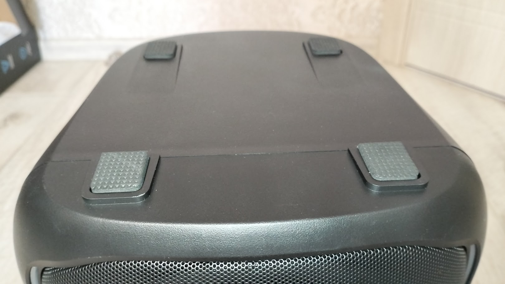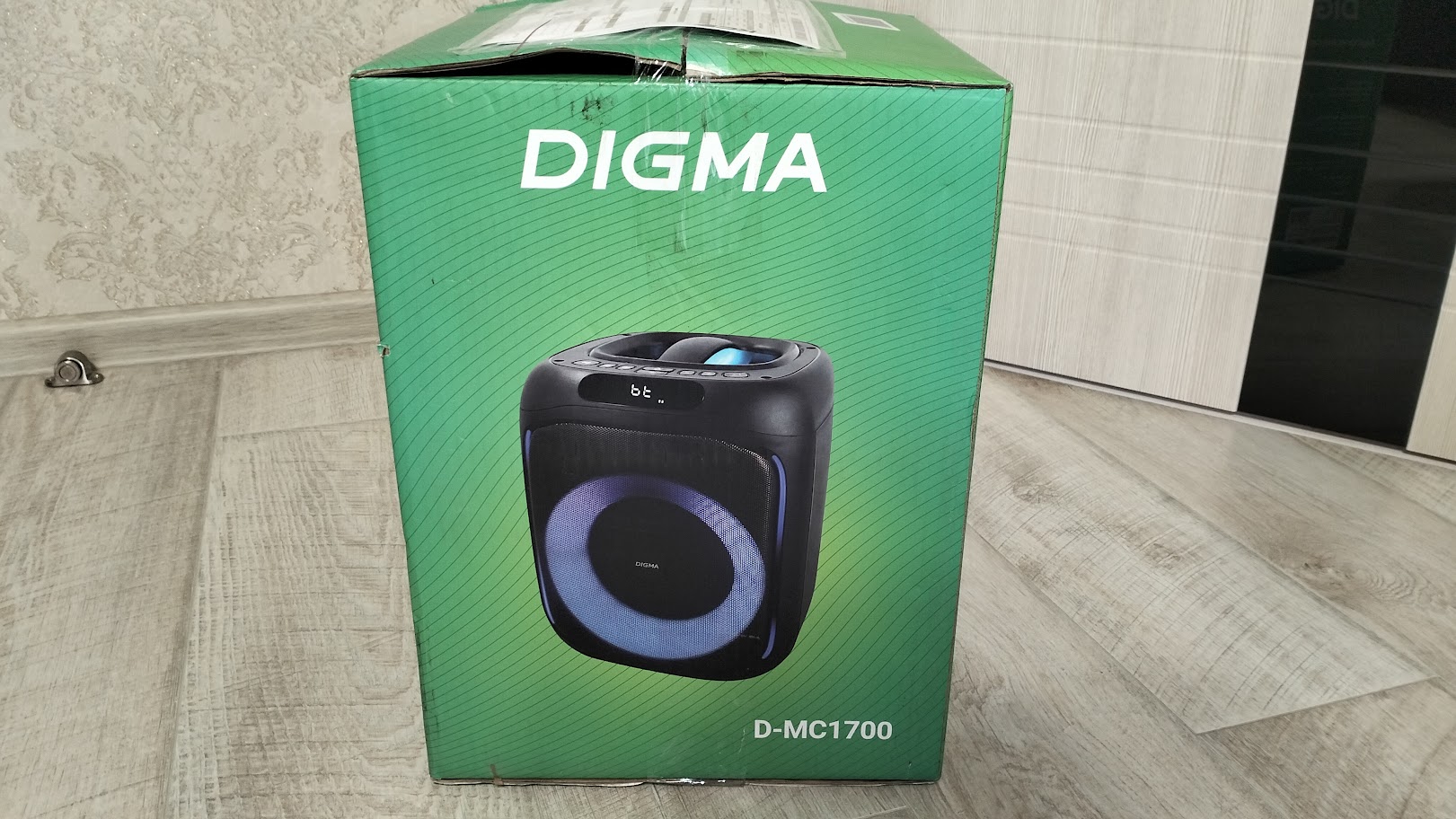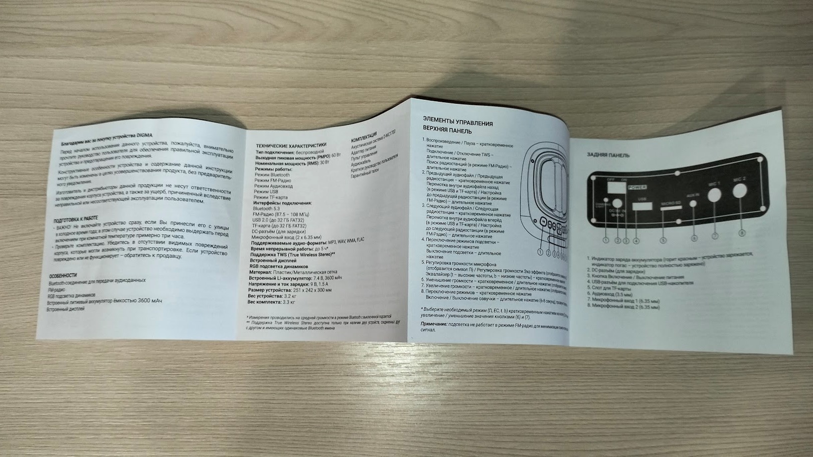 Корпус колонки выполнен из пластика и имеет размеры: 297 х 255 х 238 мм. Спереди находится металлическая сетка с логотипом Digma, которая закрывает динамики, в характеристиках указывается информация только о том, что динамик имеет диаметр 6.5 «, но через сетку явно видно наличие еще двух. Суммарная мощность составляет 30 ВТ, а пиковая 60 Вт.