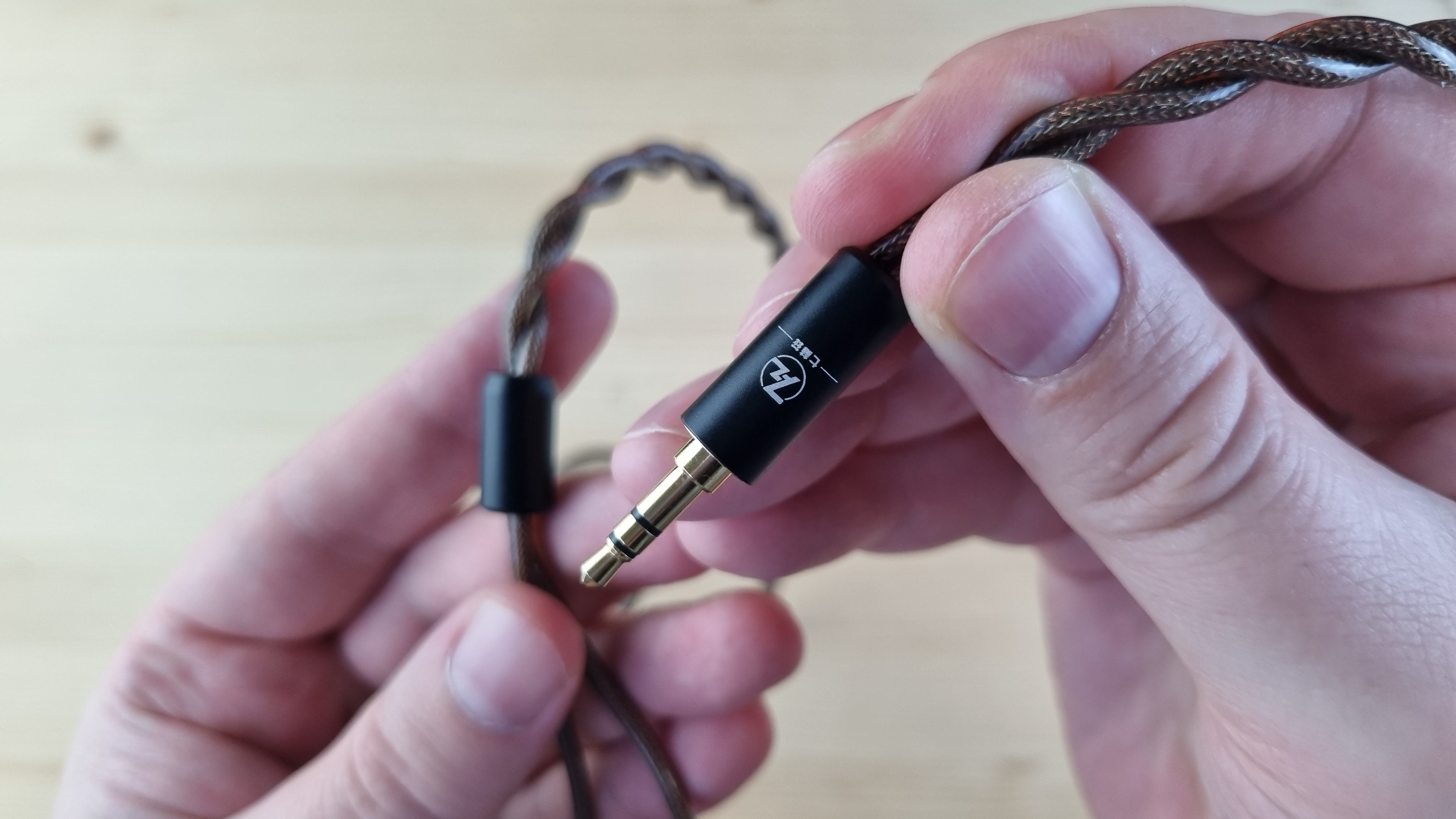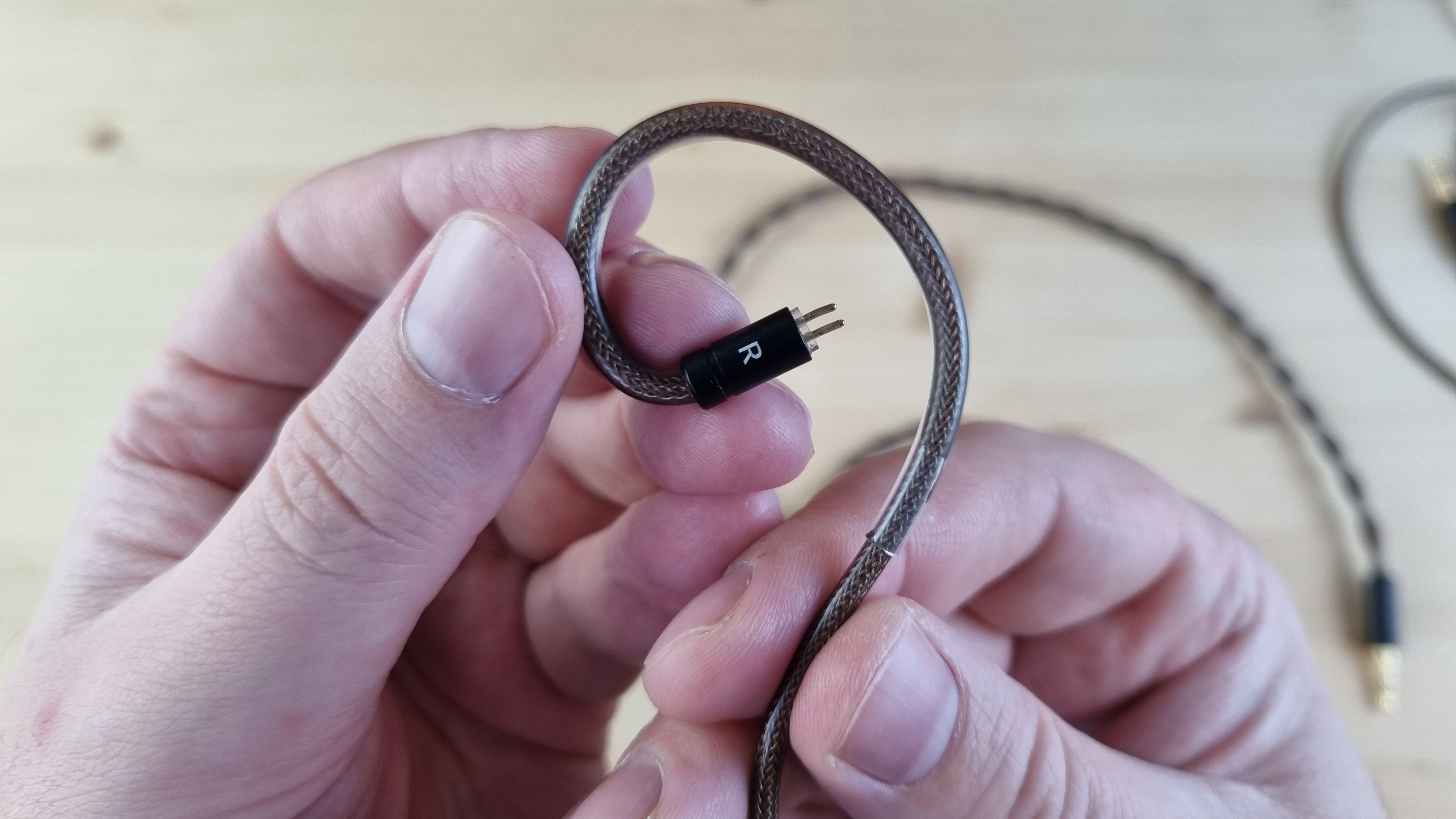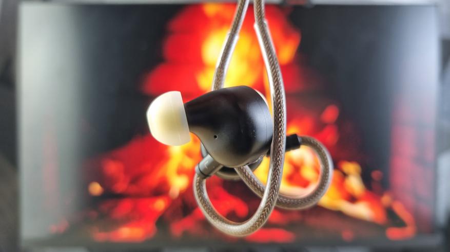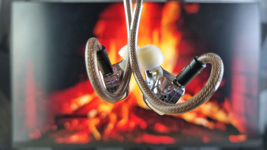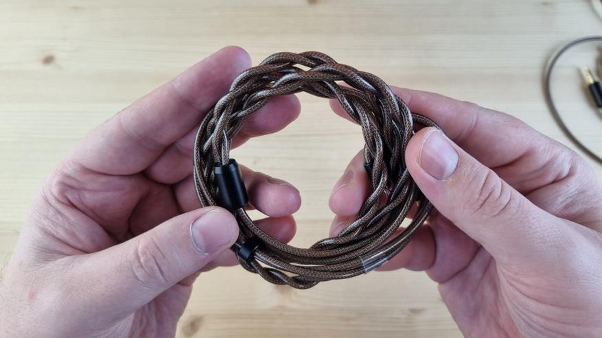 Кабель толстый, на мой взгляд, излишне тяжелый, витой, на 3.5 мм разъеме и с сопротивлением на общей жиле в 0.09 Ома, а на левом и правом каналах — по 0.24 Ома. Это такой устаревший прием для украшения звука. Одновременно с ним я использовал недорогой графеновый от KbEar.