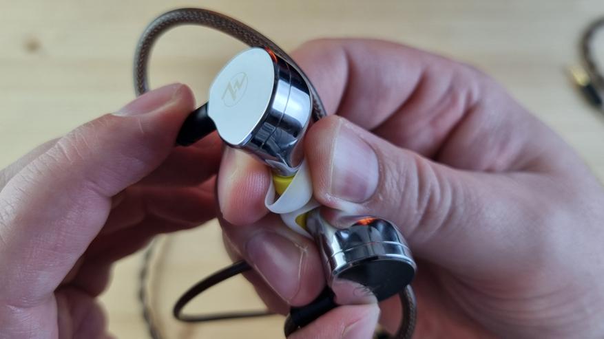 Чашечки сделаны из металла, со средних размеров, но вытянутым звуководом, целой системой отверстий для компенсации и логотипом производителя на внешней части.