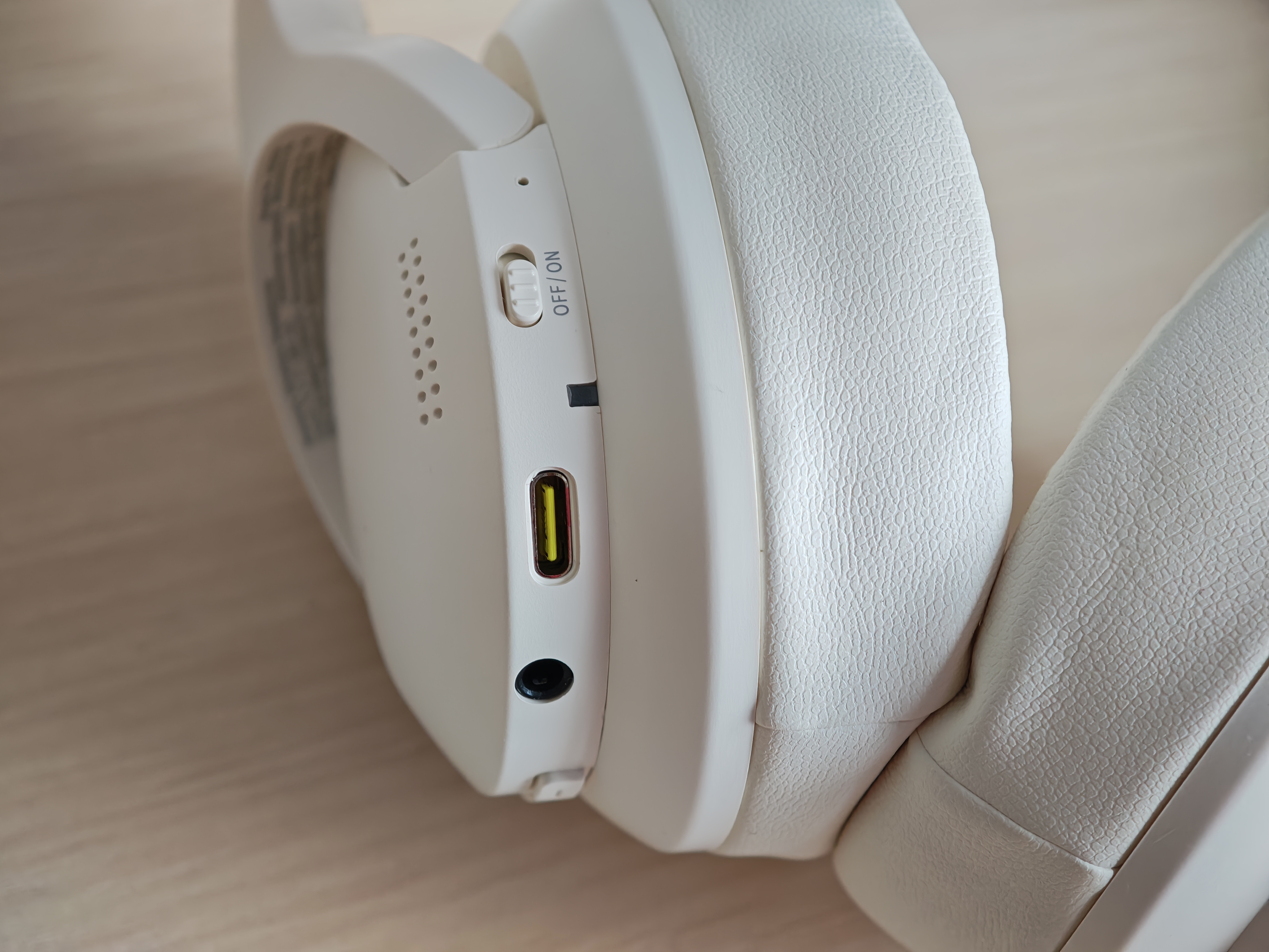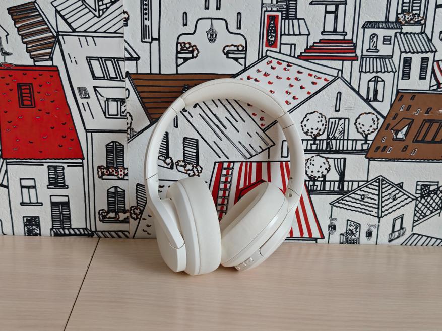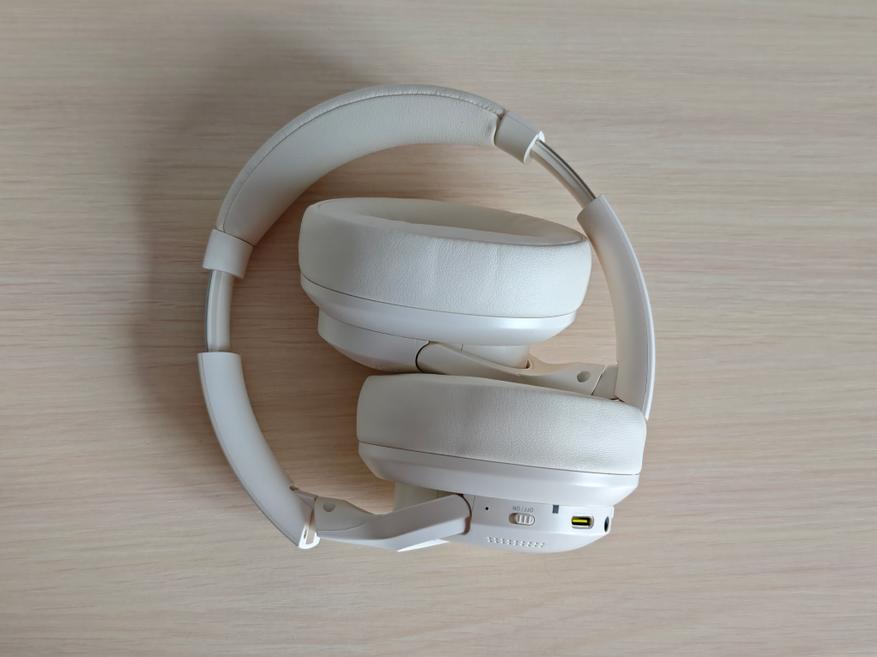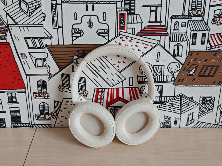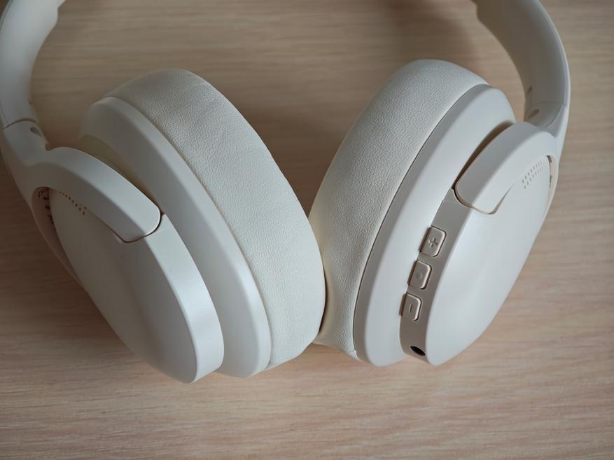 Полноразмерные наушники выполнены из белого пластика с мягкими вставками в оголовье. Крупные амбушюры из экокожи не перегревают уши при длительном использовании.