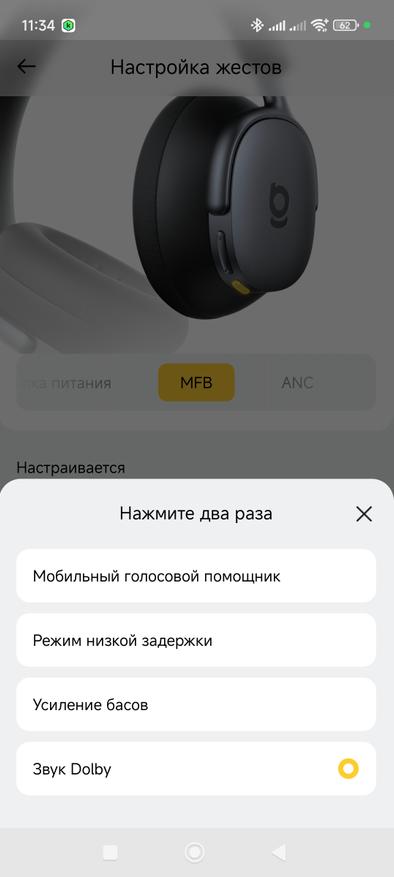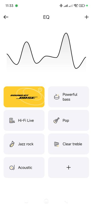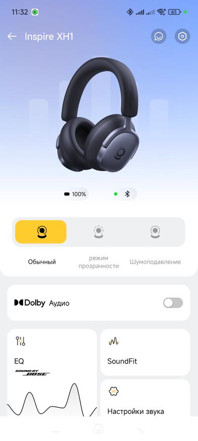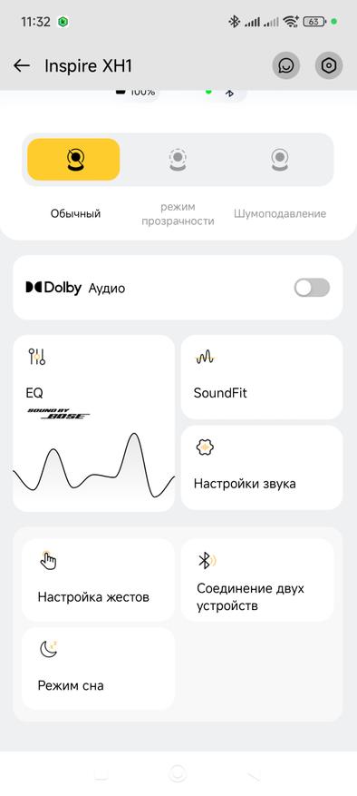 Далее вам открываются все возможности по настройке. На главном экране вы видите возможные режимы: обычный, режим прозрачности и шумоподавление. Также чуть ниже есть ползунок для переключения в режим Dolby Аудио. Ниже расположено окошко с настройками эквалайзера с 7 предустановленными режимами и возможностью ручной настройки. Отдельно тут выделен режим Sound by Bose. Стоит отметить, что его отличие от режима Powerful bass довольно заметное, вы сразу ощутите объем звучания. Лично мне решим этот понравился, я любою такой звук.