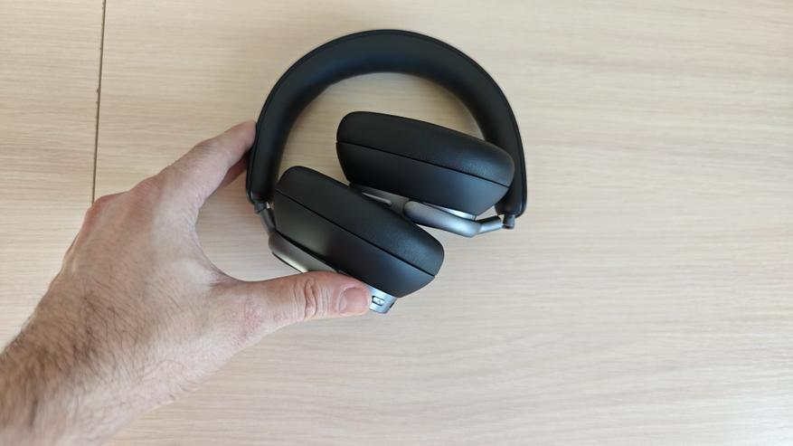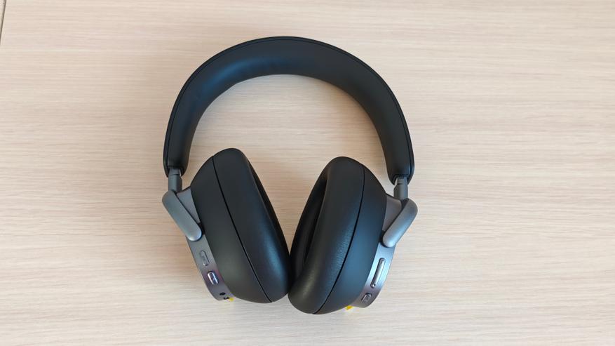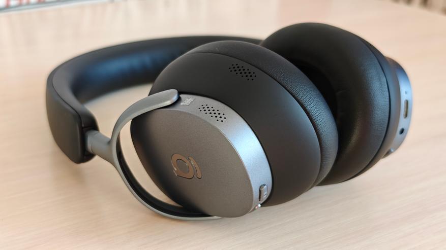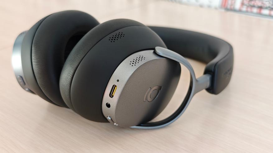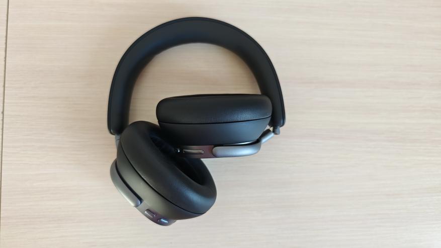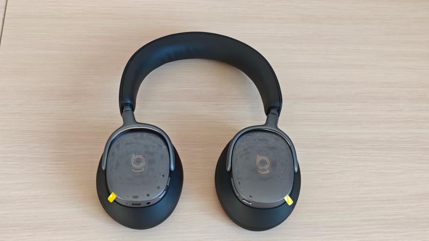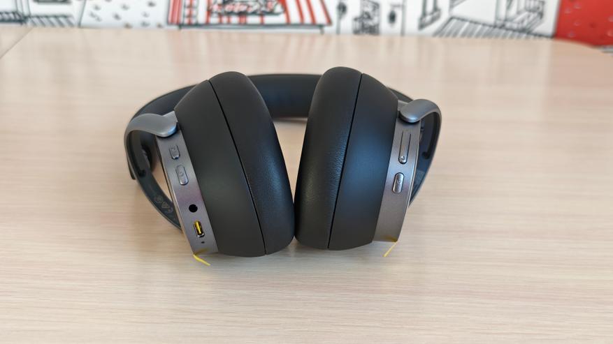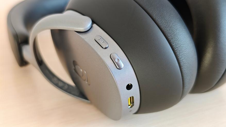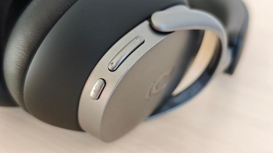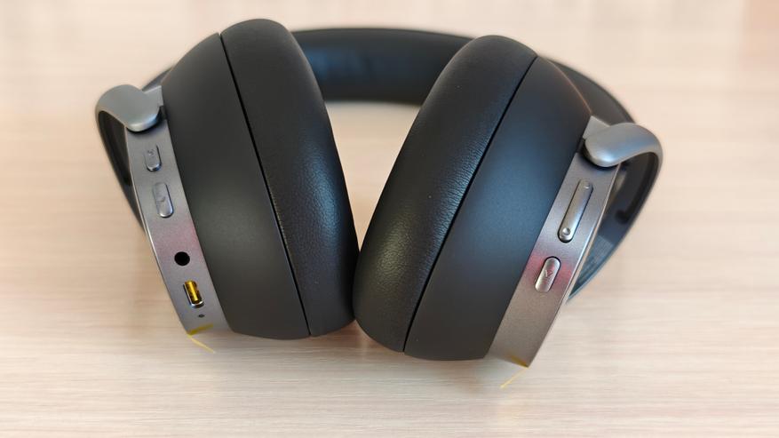 Кнопки управления расположены на обоих чашечках. На правой чашке: качелька громкости, кнопка включения воспроизведения и паузы. На левой кнопка ANC/режима прозрачности, порт USB-C и разъём 3,5 мм. Логика управления интуитивная, ложных нажатий при ношении не возникает. Вообще мне понравилась конструкция. Кнопки нажимаются легко и плавно, тактильно приятная на ощупь конструкция, да и визуально мне они понравились.
