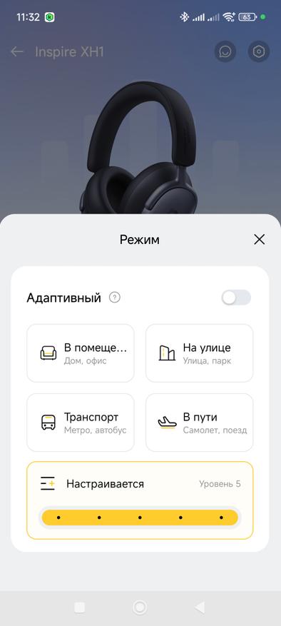 Вернусь к режиму шумоподавления. Тут есть несколько режимов: адаптивный (т.е. автоматический), в помещении, на улице, в транспорте и в пути (самолет, поезд). Плюс ручной режим. На мой взгляд тут большое количество возможностей для настройки комфортного шумоподавления под конкретного пользователя.