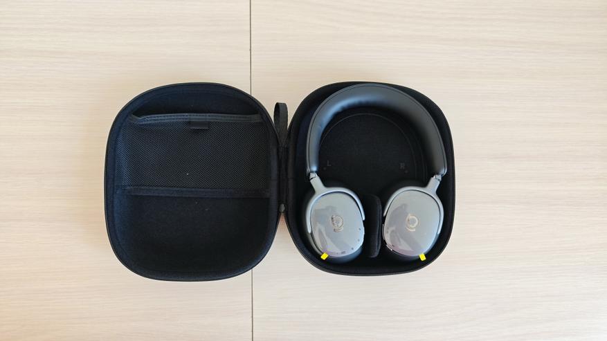 Чехол заслуживает отдельного упоминания. Он твердый, с внутренней перегородкой для кабелей, достаточно жёсткий, чтобы защитить наушники в рюкзаке, но при этом не занимает лишнего места. В комплекте нет зарядного блока — только кабель, что сейчас стало стандартом. Лично мне понравилось, что в комплекте есть чехол. Я часто беру с собой в поездку наушники и каждый раз боюсь, что сломаю в рюкзаке, а тут все довольно надежно.