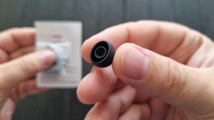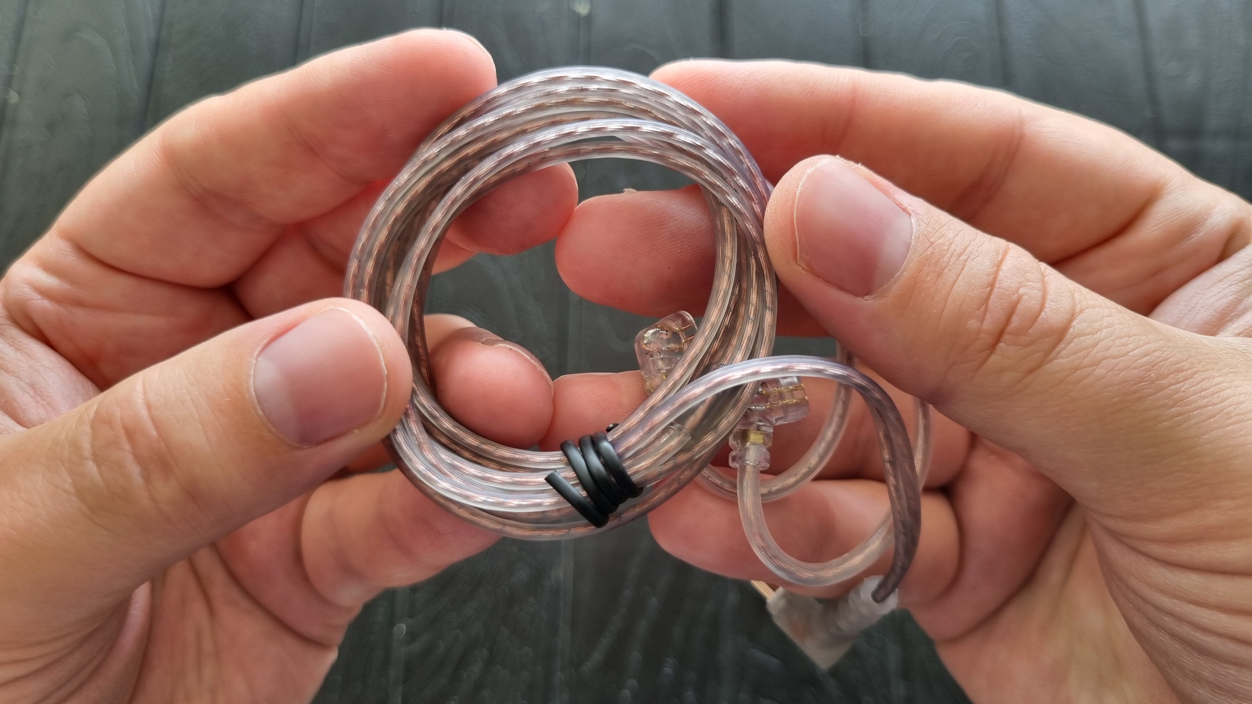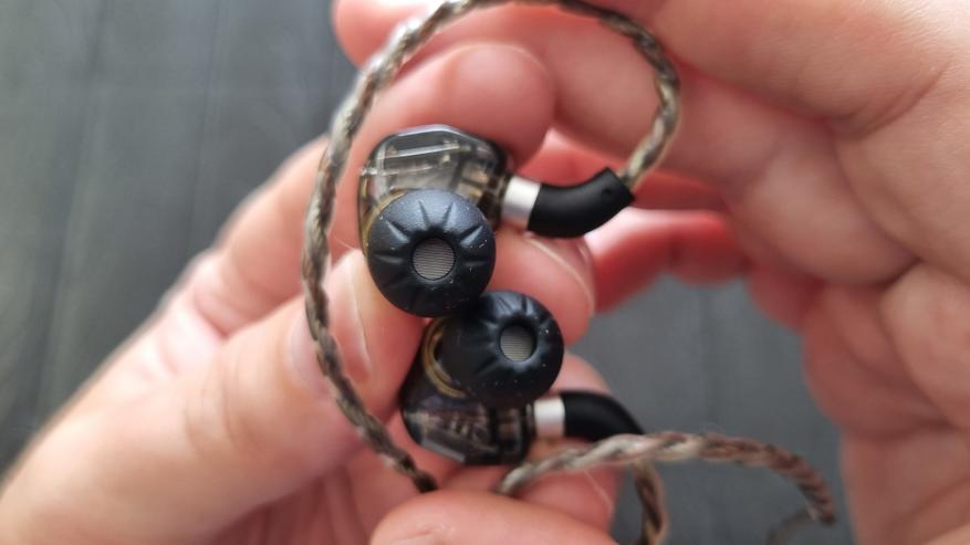 Внутри лежала инструкция, классические уже черные насадки с насечками, металлическая скрепка и серый полупрозрачный кабель, впрочем он ровно такого же посредственного качества. Как обычно, рекомендую его заменить на TRN RedChain, который со съемными штекерами.