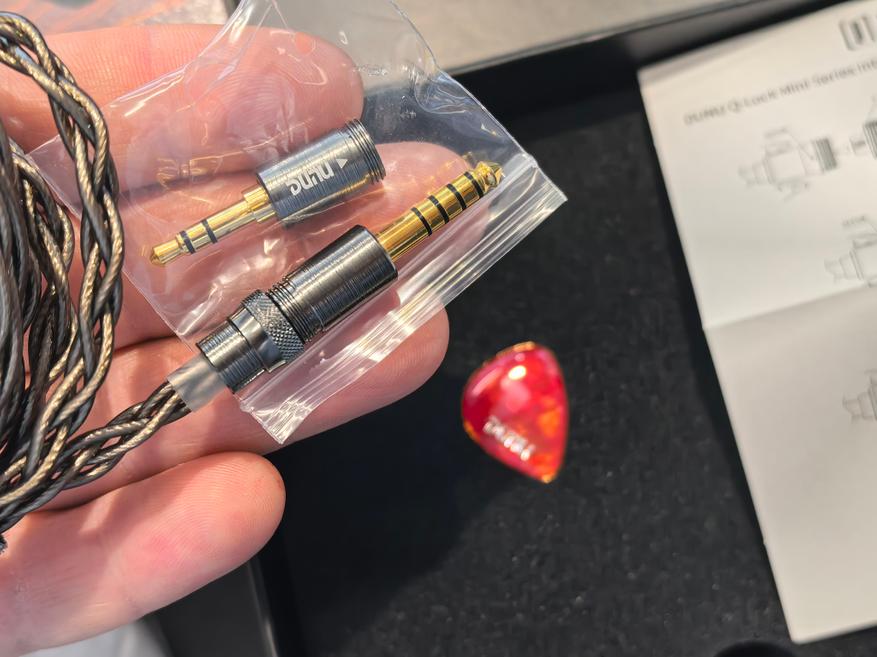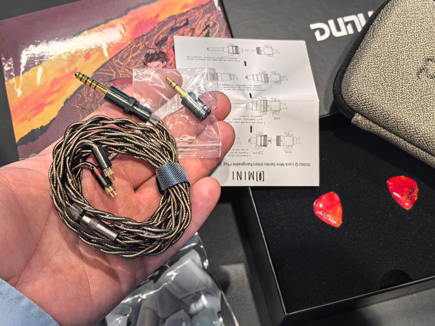 Как это всегда бывает, внутри есть сменные амбушюры. Я достал специально с узким горлышком, так как акцент баса в недавних моделях мне уже поднадоел. Есть щётка для чистки наушников и переходник на 6,35 мм. У кабеля фирменные сменные коннекторы Q-Lock Mini.