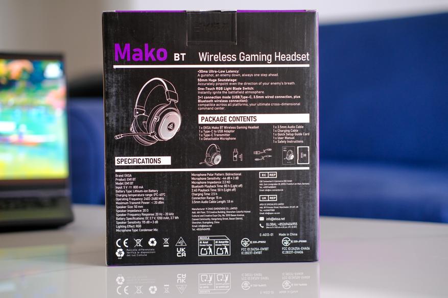 Наушники поставляются в симпатичной коробке в фирменном стиле EKSA. Здесь они любят прям на упаковке указать свою направленность в игры, поэтому не стесняются использовать яркие расцветки