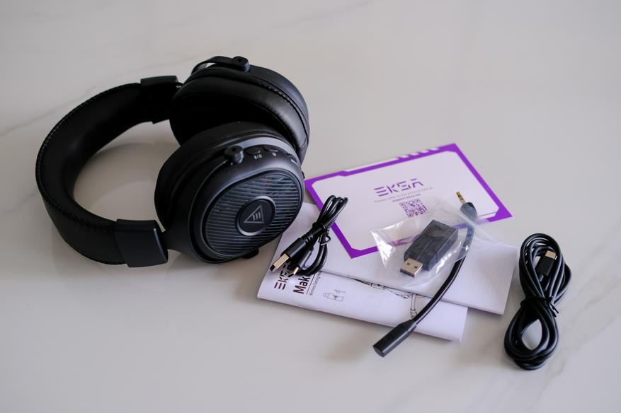 Комплект состоит из самих наушников, шнура для подзарядки, шнура type-C на 3.5мм, съёмного микрофона, беспроводного универсального адаптера и набора макулатуры.