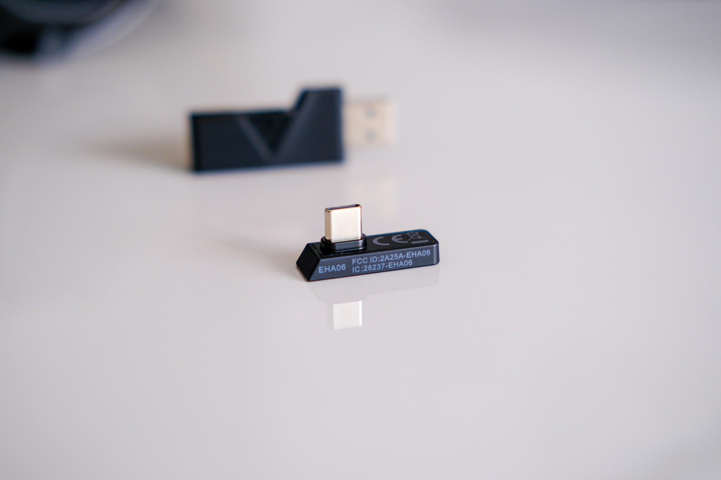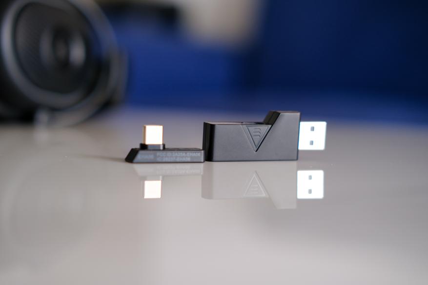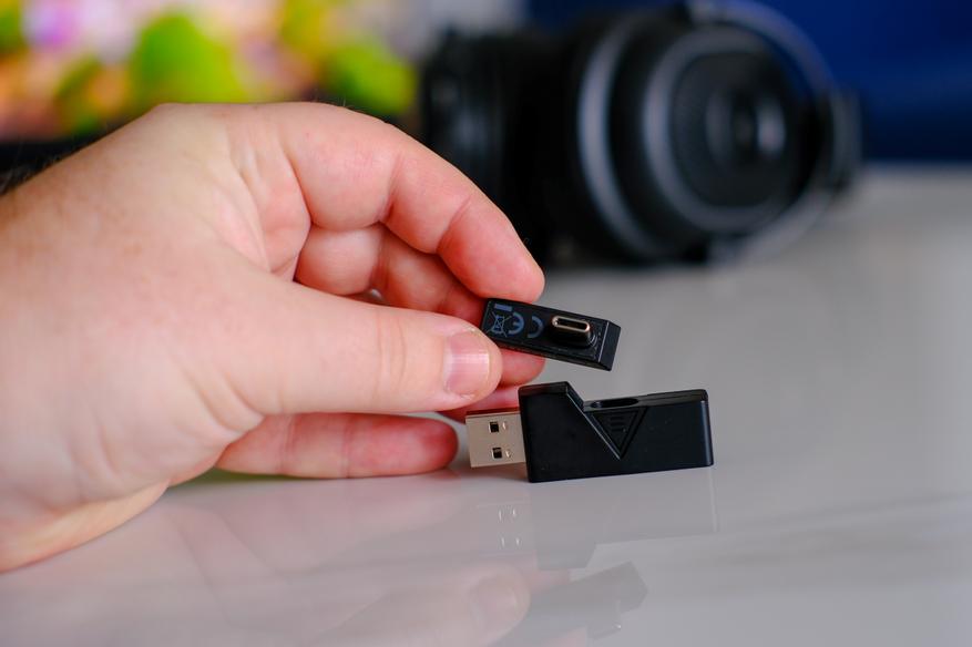 Если же хотим слушать музыку по воздуху, то есть беспроводной адаптер. И мне нравится как производитель реализовал его. Из-за элегантного решения, можно не переживать о том, какой у вас порт. Потому что адаптер может подключиться хоть к USB A, хоть к Type-C