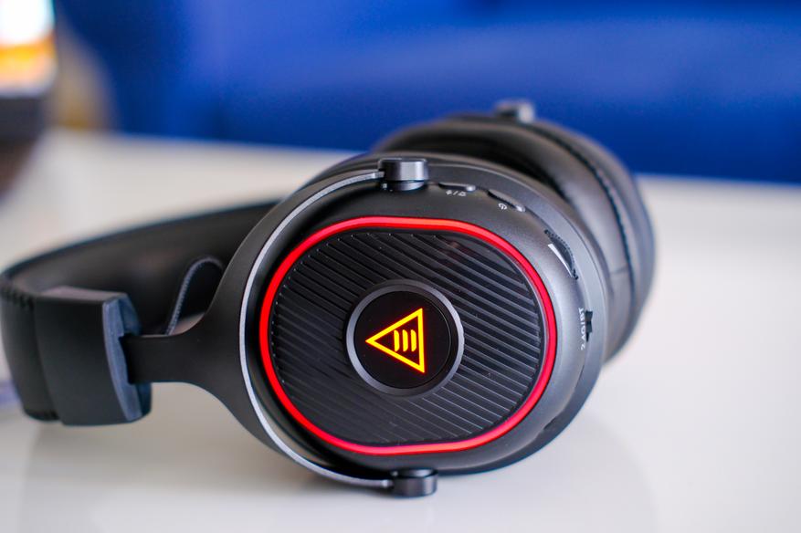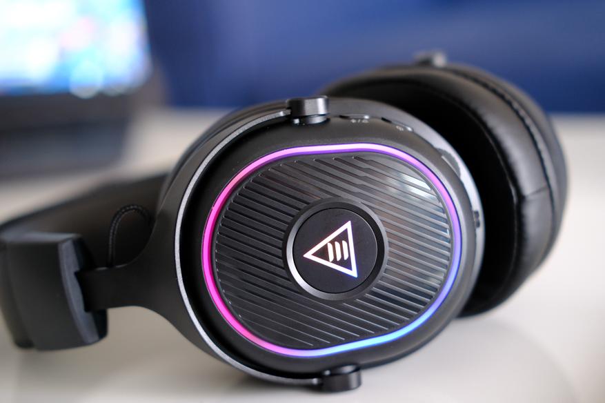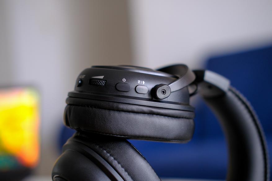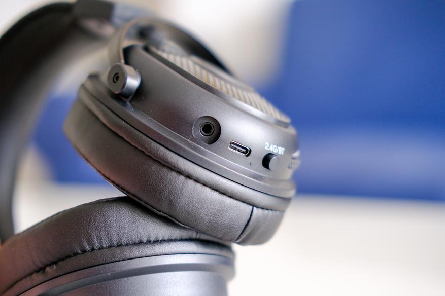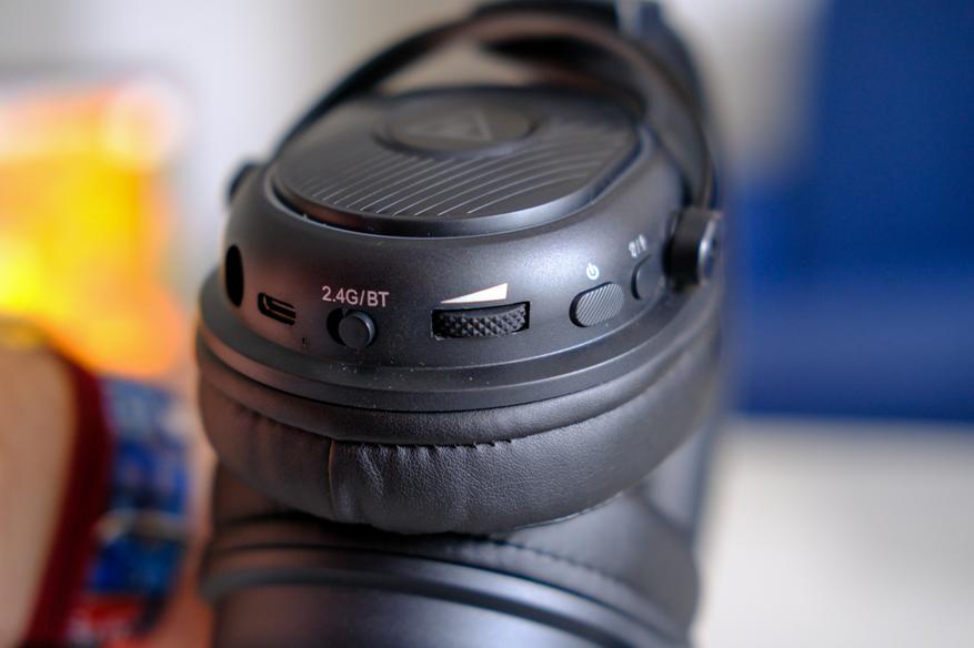 С наружной стороны все элементы управления находятся только на левой чашечке. Здесь вход AUX для подключения микрофона, порт Type-C, рычажок переключения типа подключения, механическое колесо регулировки громкости, кнопка включения и кнопка активации микрофона и подсветки.